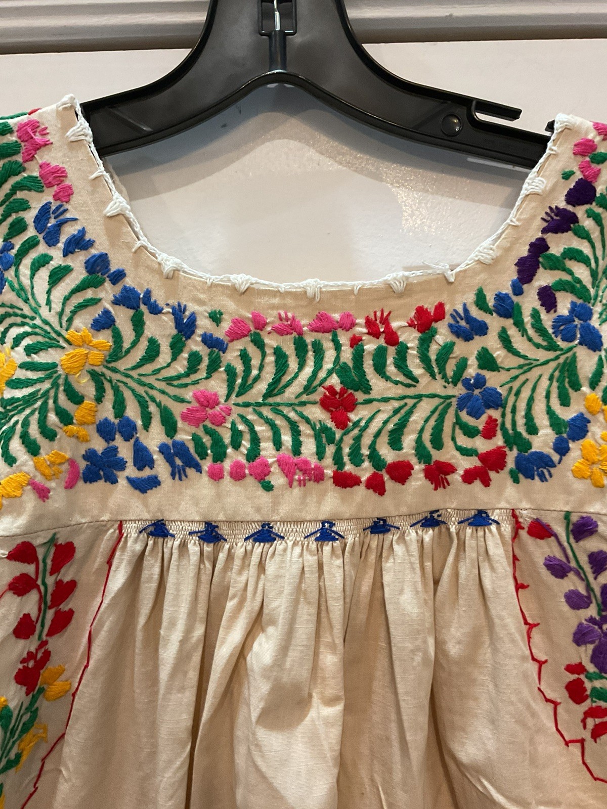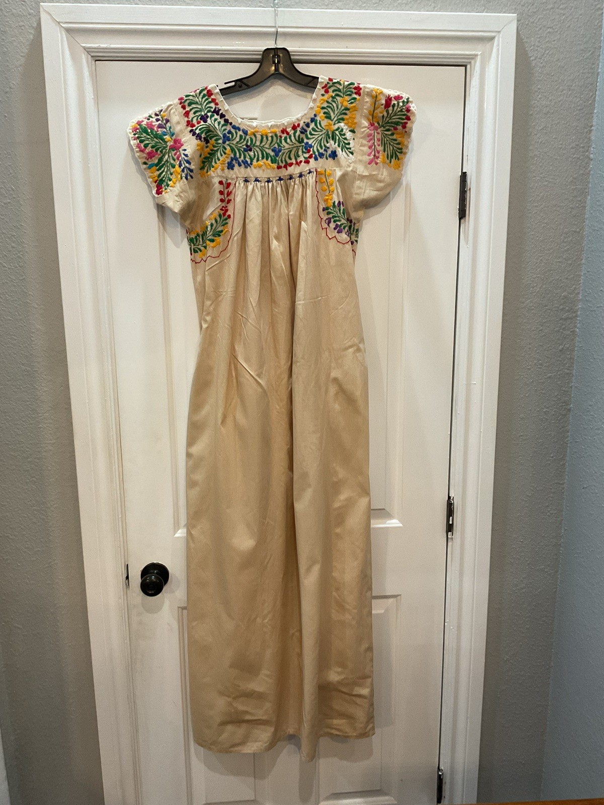 Beautiful 1970s Oaxacan Beige Dress Multi Color Embroidery White Crochet Size S