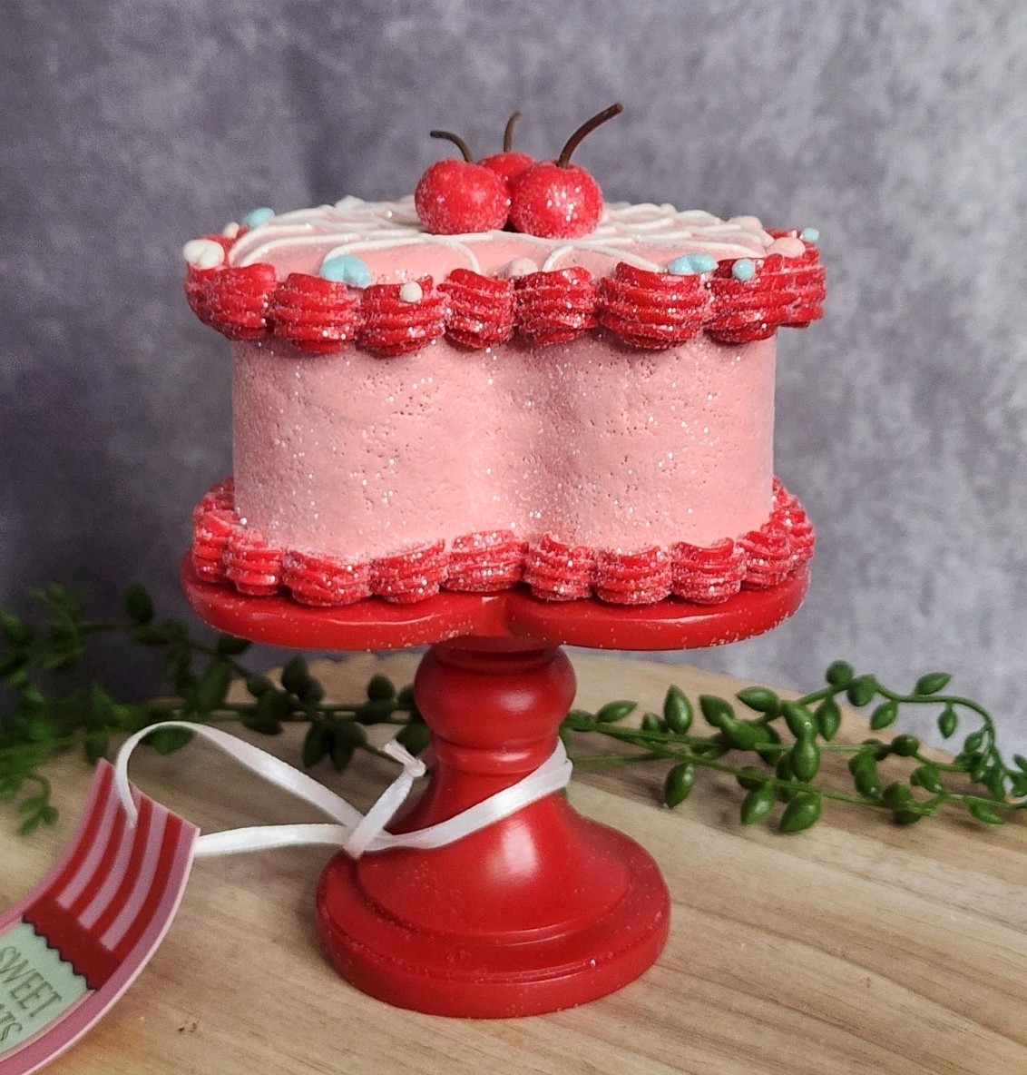 Valentines Day Sweet Treats Heart Cake with Cherries Pink Red Pedestal 6 NEW