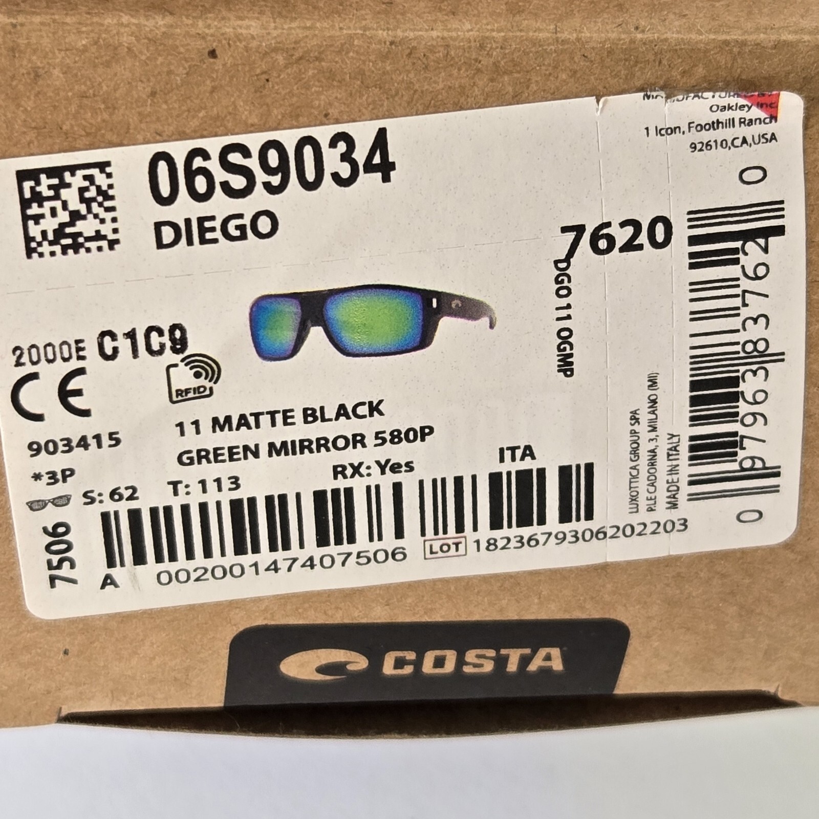 COSTA Del Mar DIEGO Matte Black/Green Mirror Polarized Sunglasses 580P 06S9034