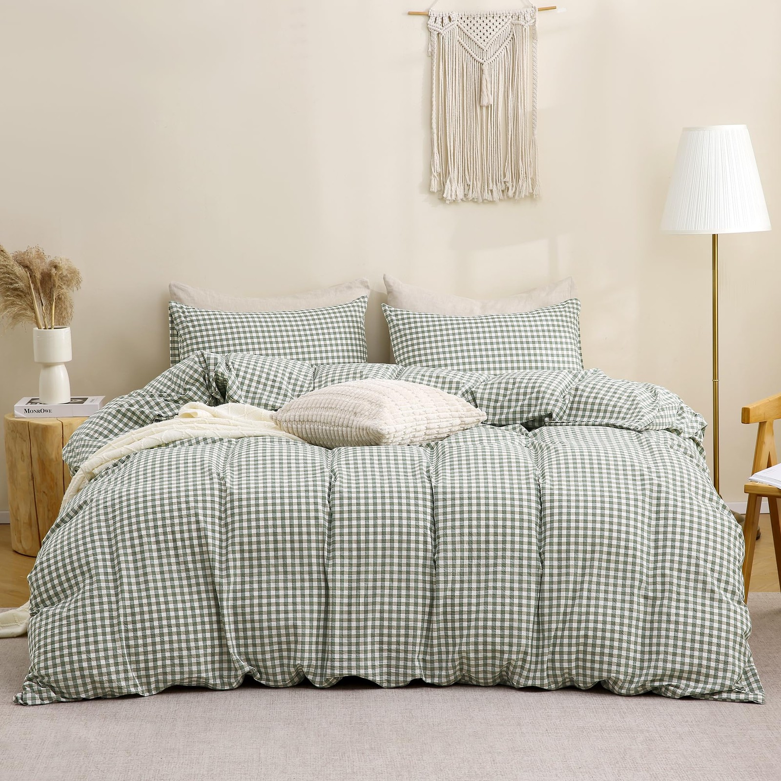 как выглядит Green Gingham Duvet Cover Bedding Set 100 Washed Cotton Like Linen Feel Supe... фото