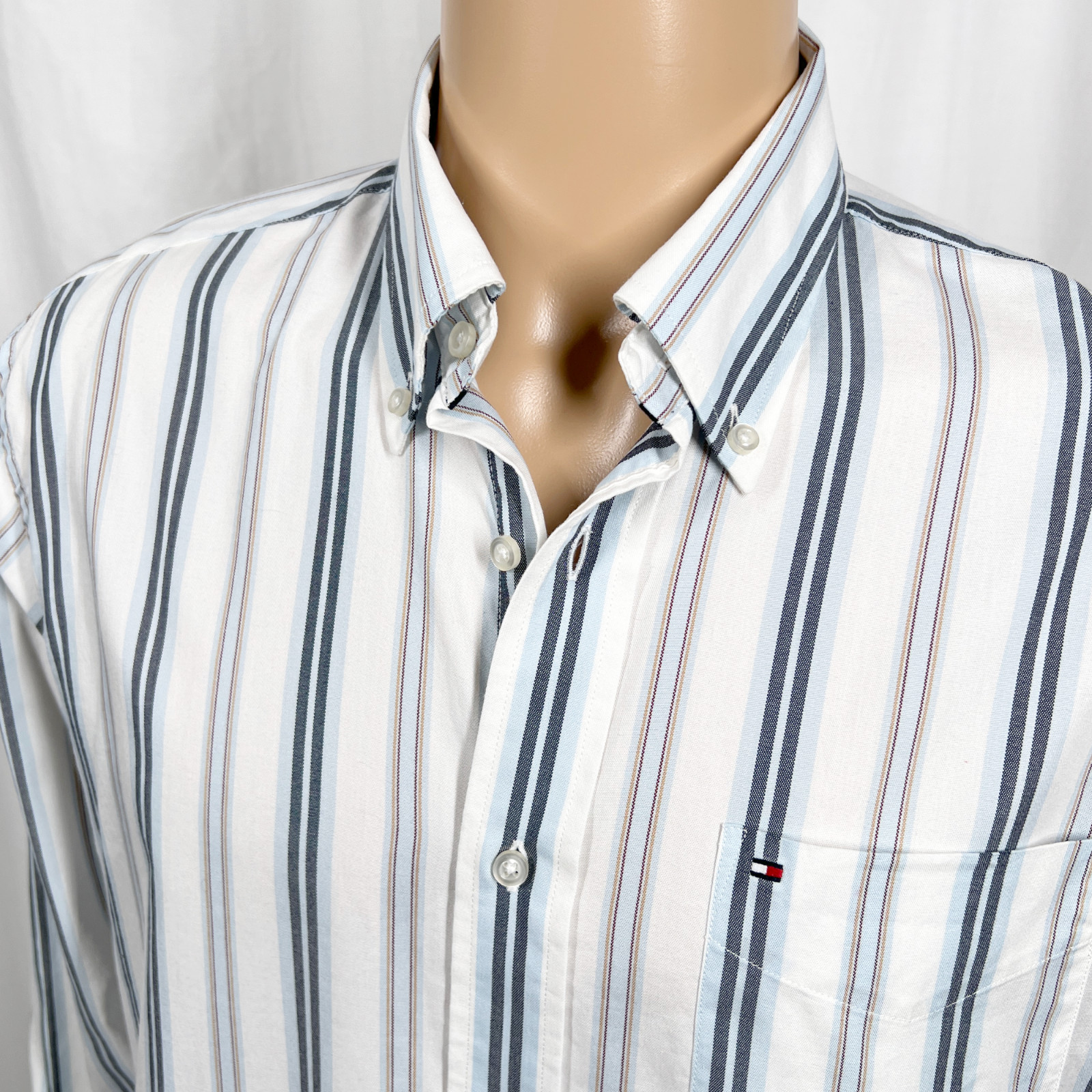 как выглядит Tommy Hilfiger Mens Medium Blue White Striped Long Sleeve Button-Up Shirt фото