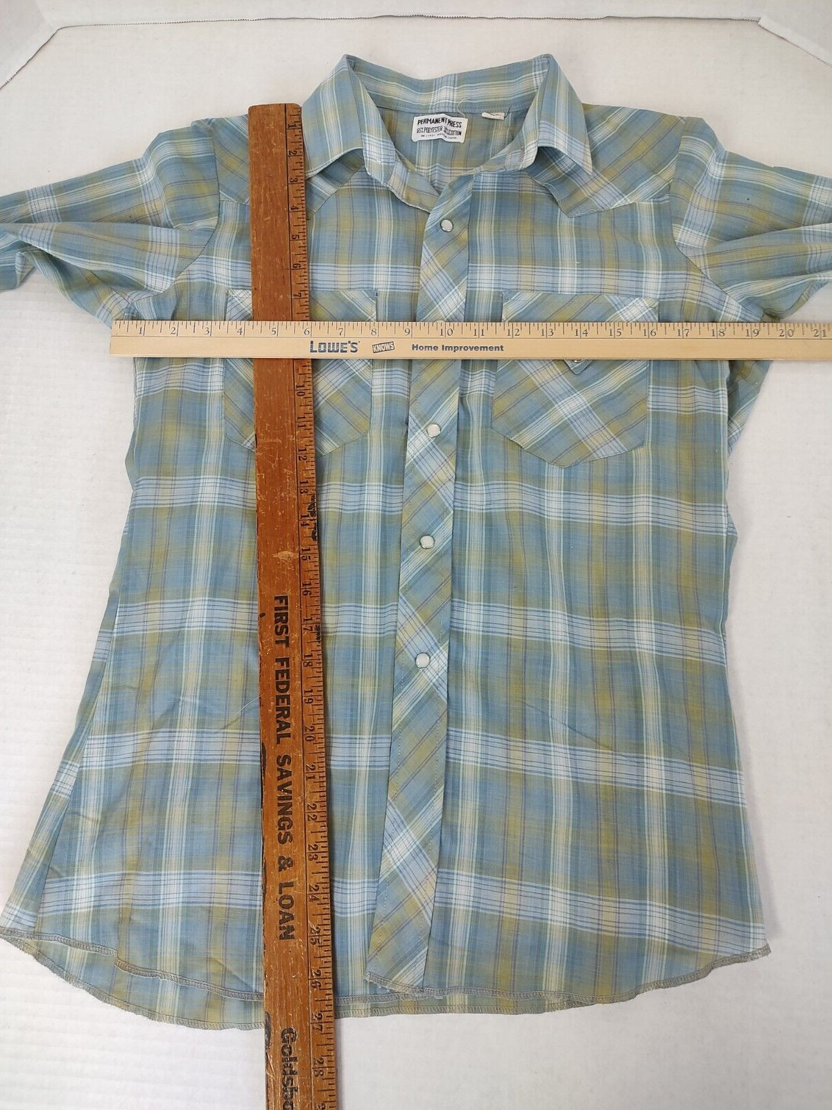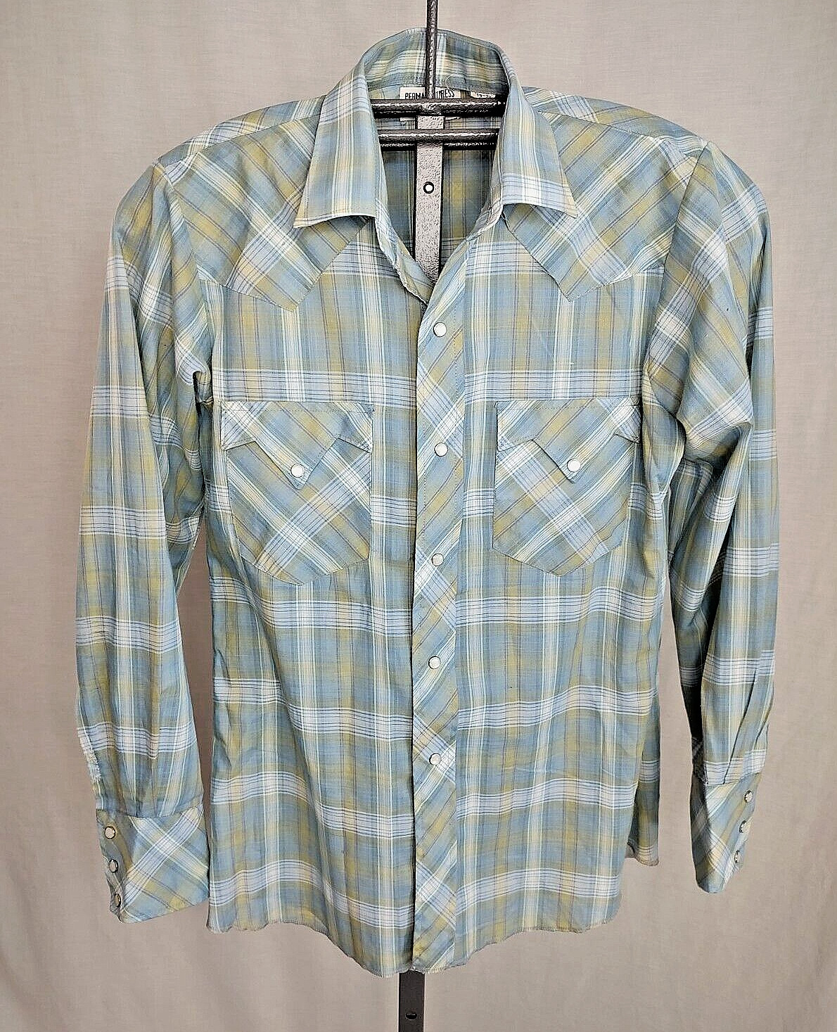 как выглядит Vtg 60s Pearl Snap Plaid Western Shirt Mens Small Polyester/Cotton Distressed фото