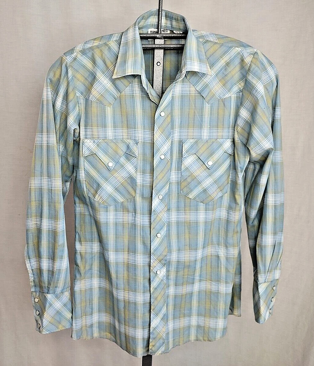 Vtg 60s Pearl Snap Plaid Western Shirt Mens Small Polyester/Cotton Distressed
