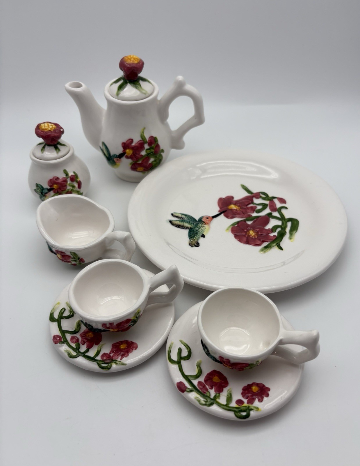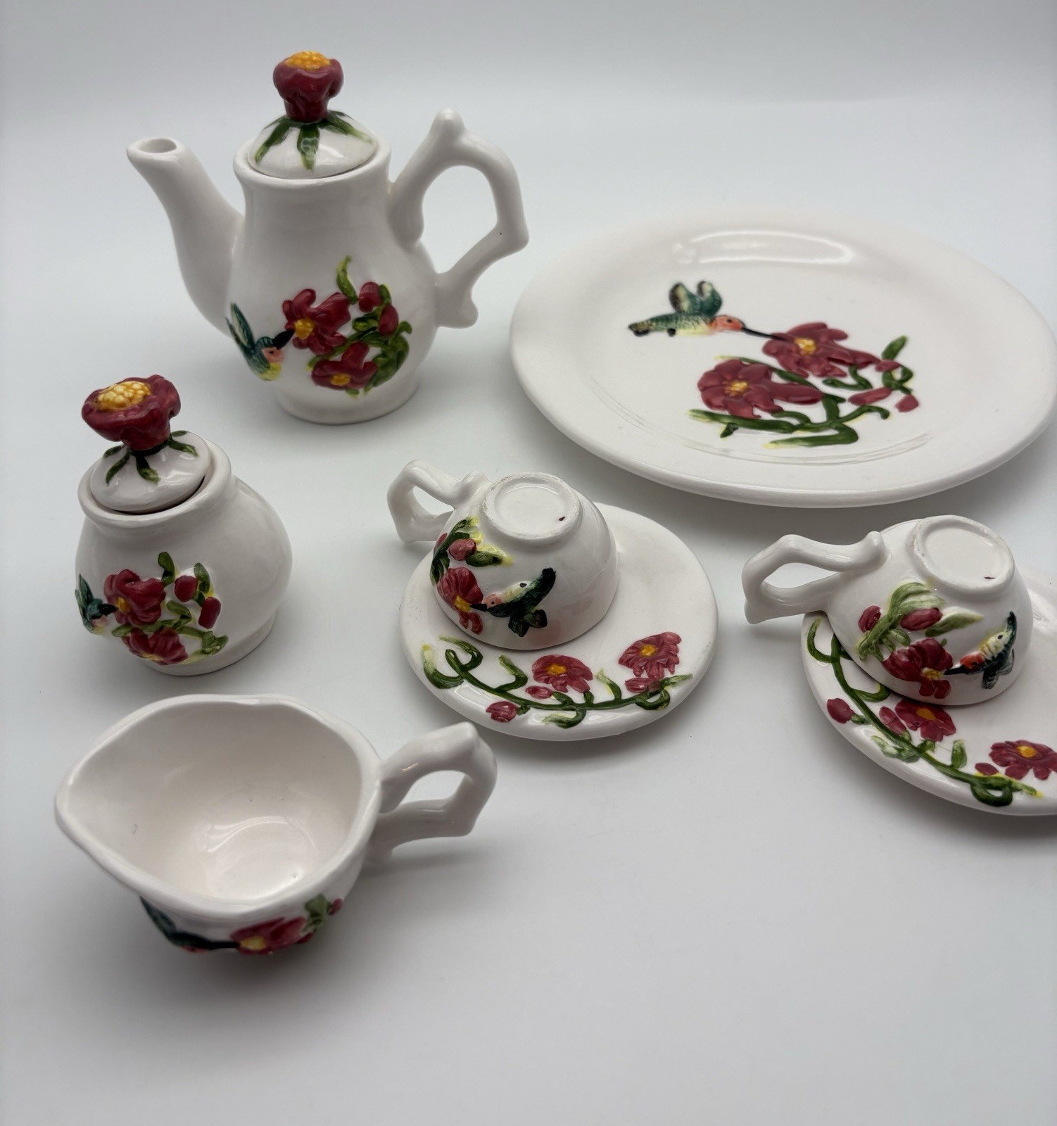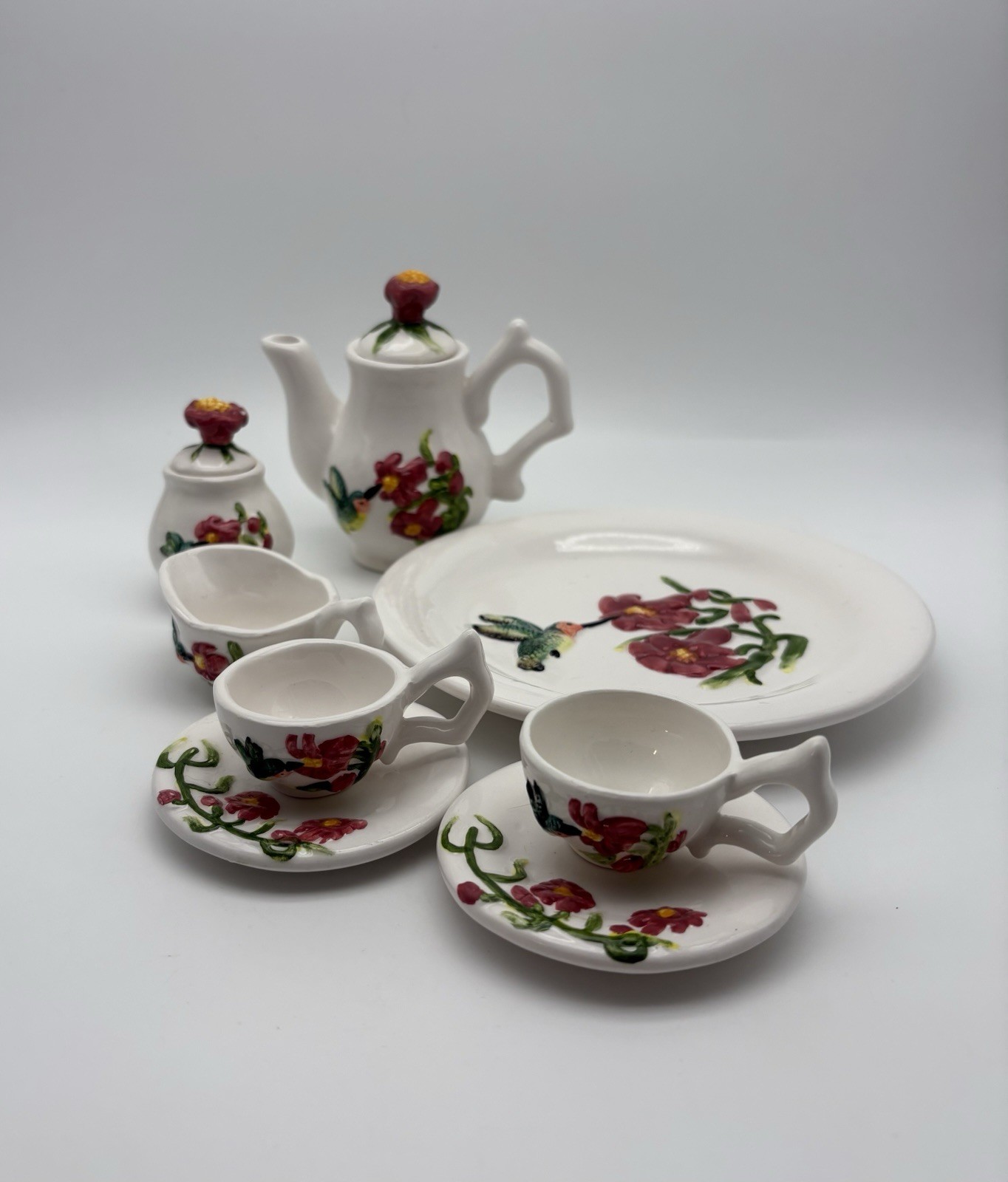 • Vintage Young's Inc 1997 Hummingbird Miniature 10 Piece Ceramic Tea Set Cute