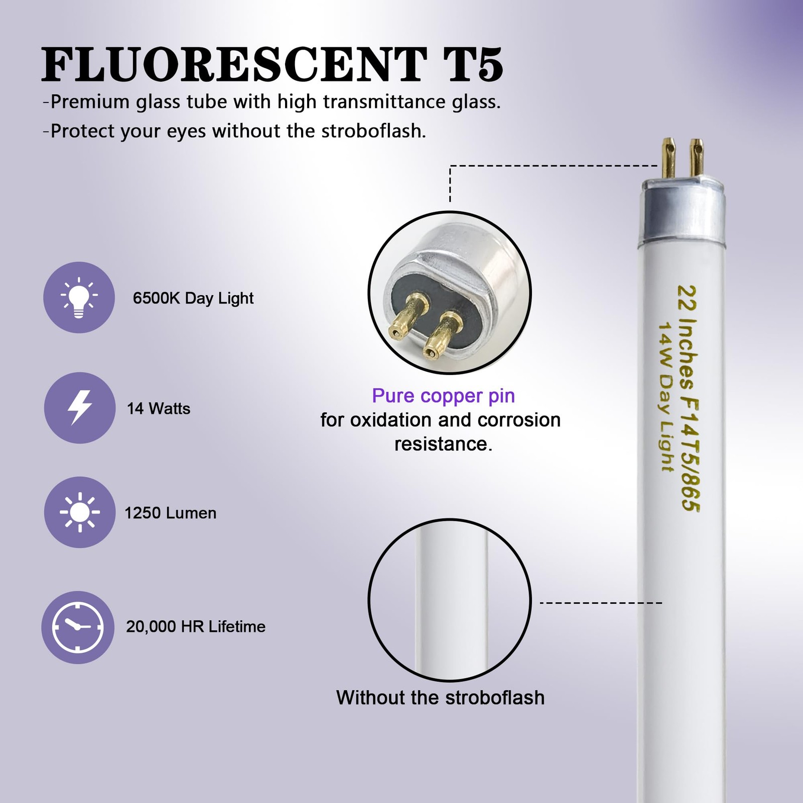 amgolibi T5 14W 6500K Fluorescent Tube, 22 Inches F14T5/865 Straight Fluorescent