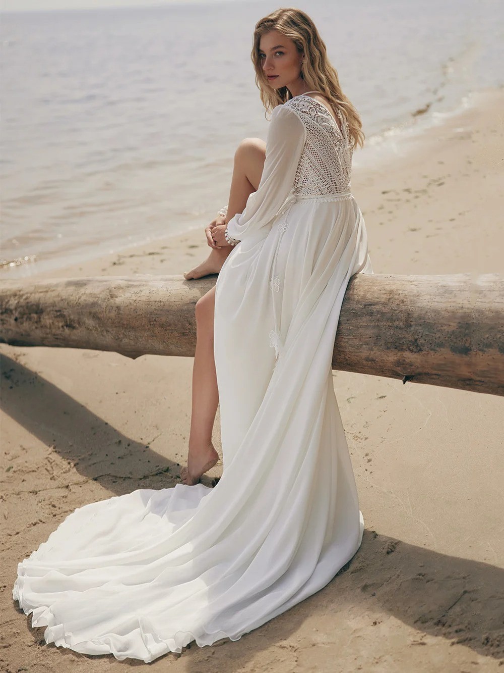как выглядит Bohemian Lace Beach Wedding Dress Customized Puff Sleeves V Neck See Through фото