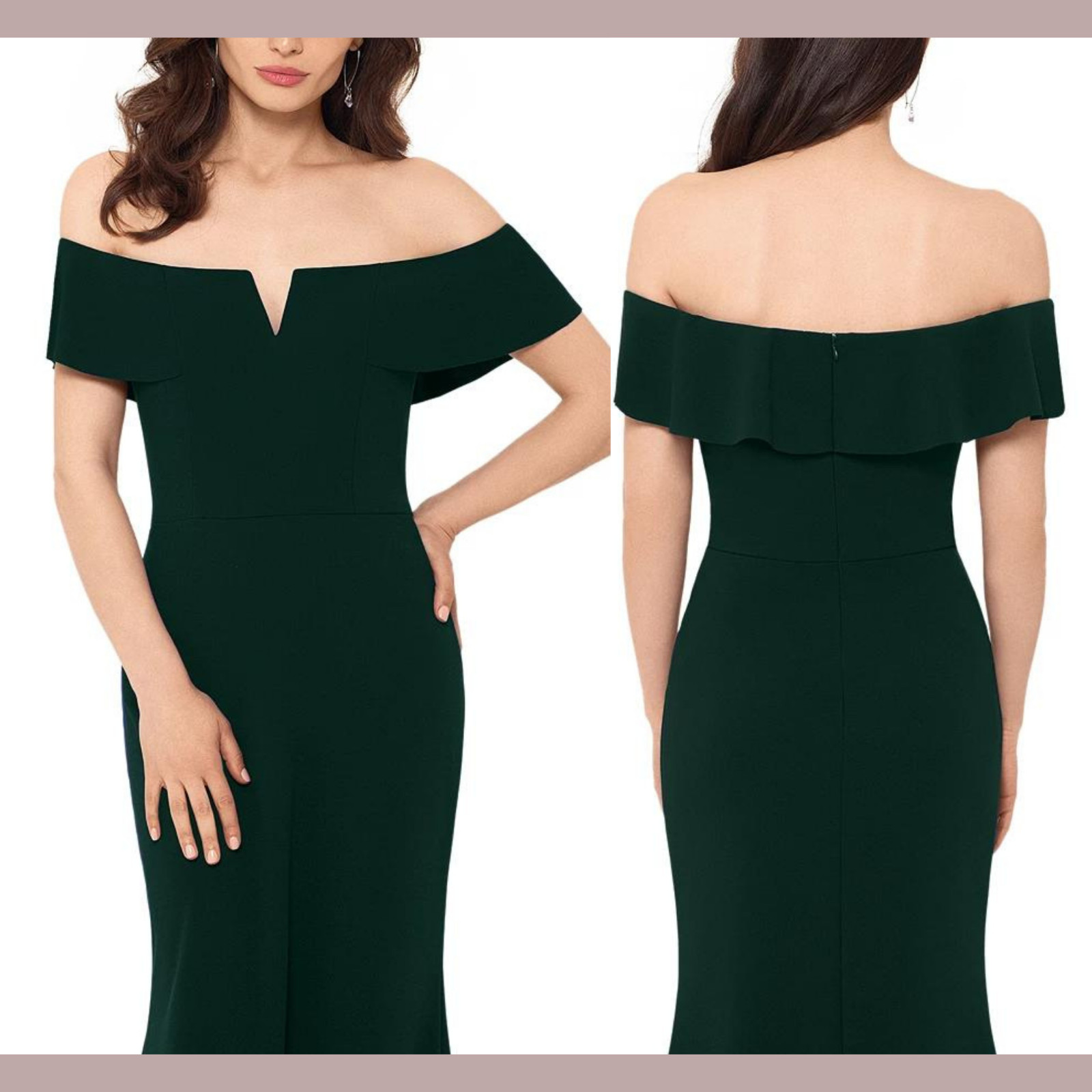 как выглядит NWT 239 Betsy Adam 4P PETITE Off The Shoulder Gown in Pine Green S203 фото