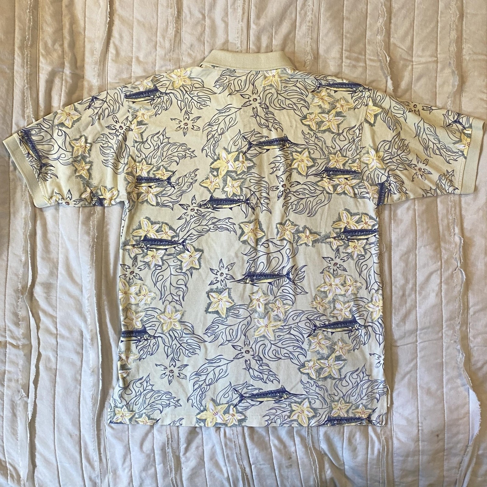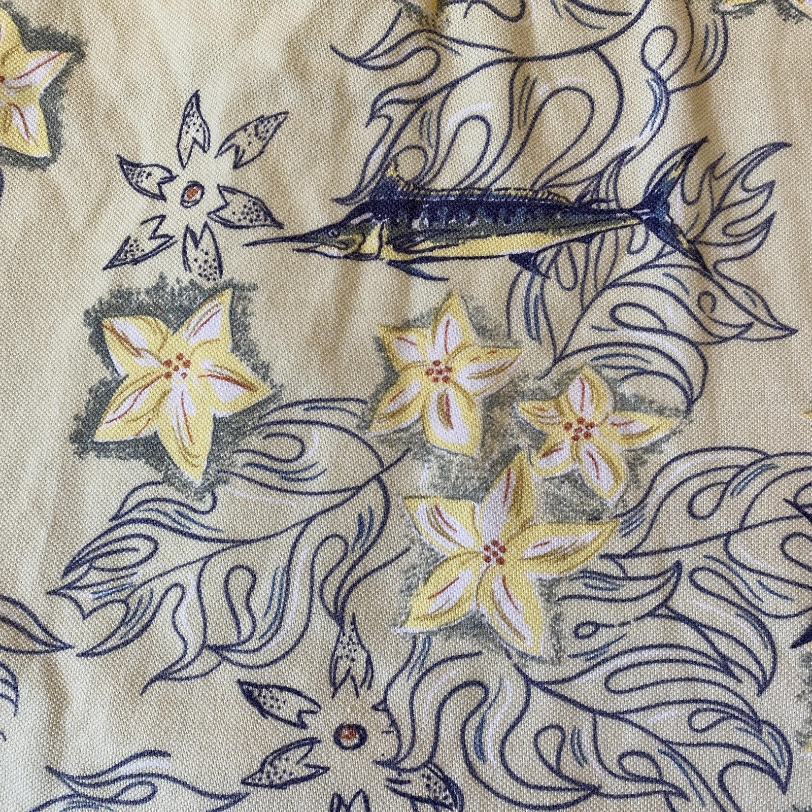 AFTCO Shirt Mens Large Yellow Marlin Floral Polo Genuine Bluewater Fishing