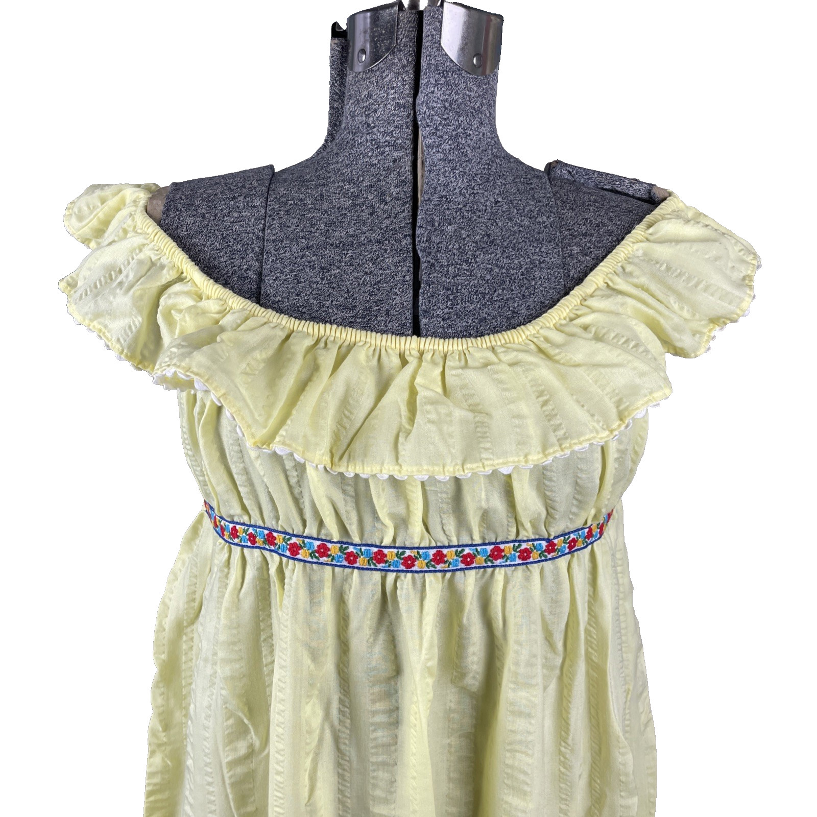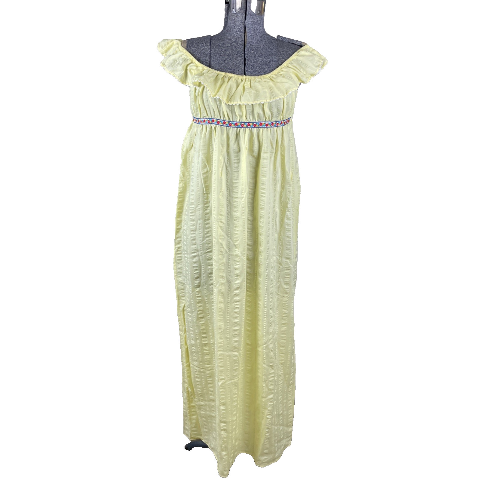Vintage 70s Yellow Seersucker Maxi Dress Size XS Off Shoulder Ruffle