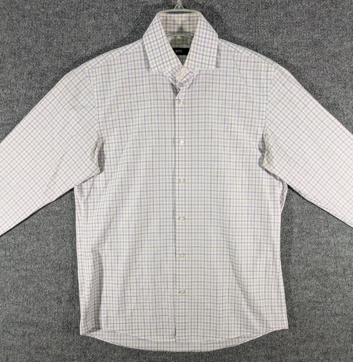 Hugo Boss Button Up Dress Shirt Mens 15.5 34/35 White Purple Check Long Sleeve