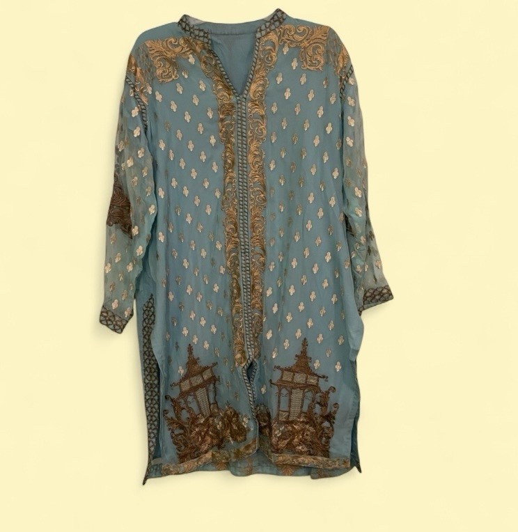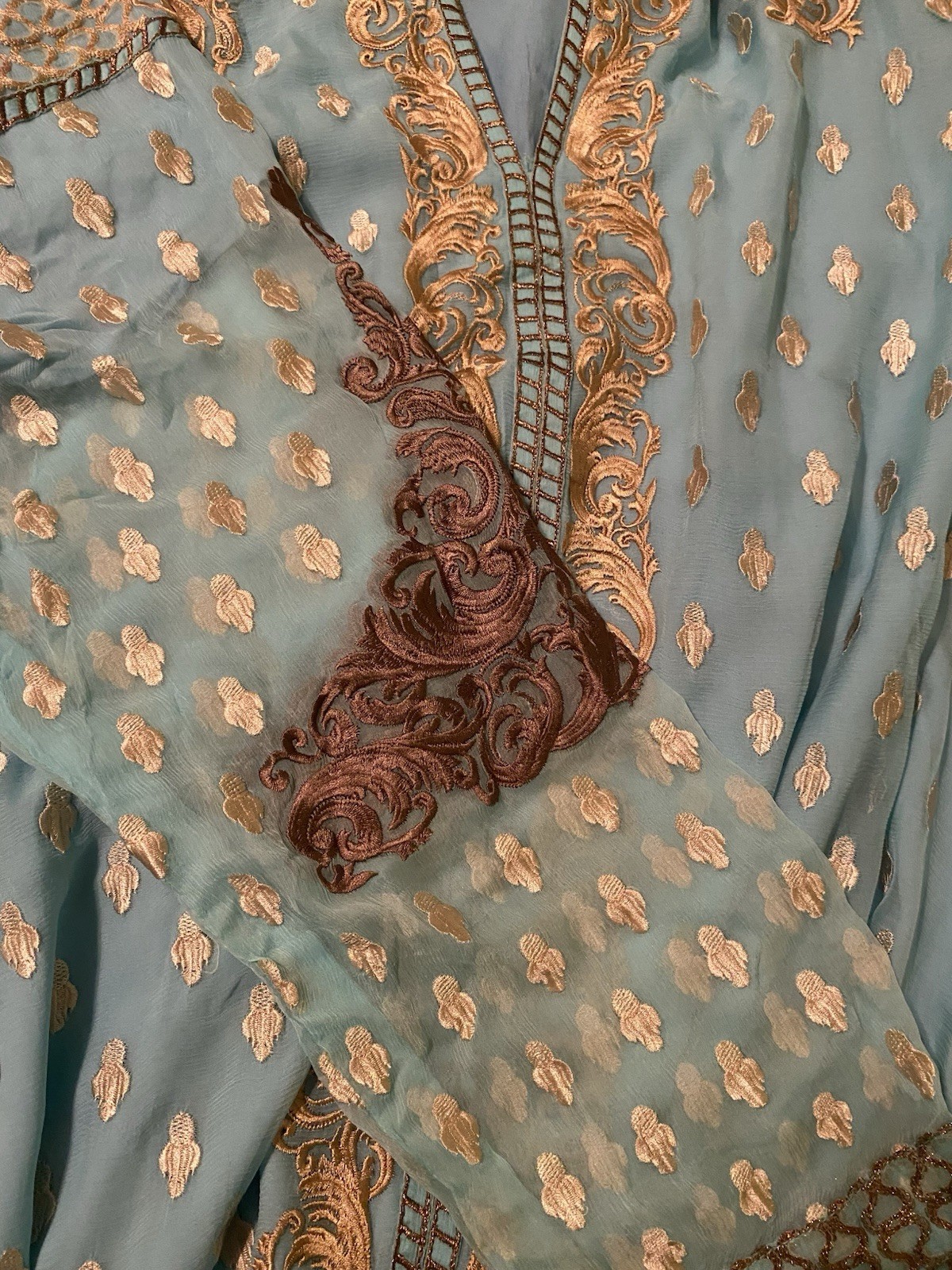 как выглядит Blue Brown Gold Chiffon Embroidered Pakistani Salwar Kameez Set for Women фото