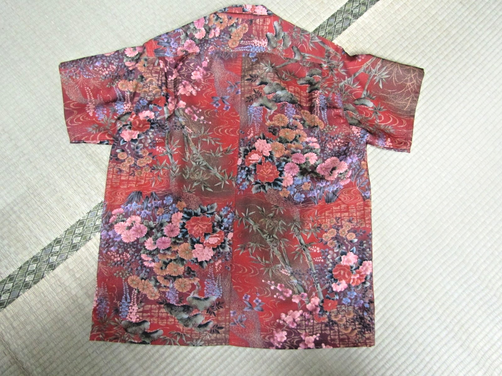 как выглядит Japanese Antique Silk Kimono Aloha Shirt Mens M Red Peony Chrysanthemum фото