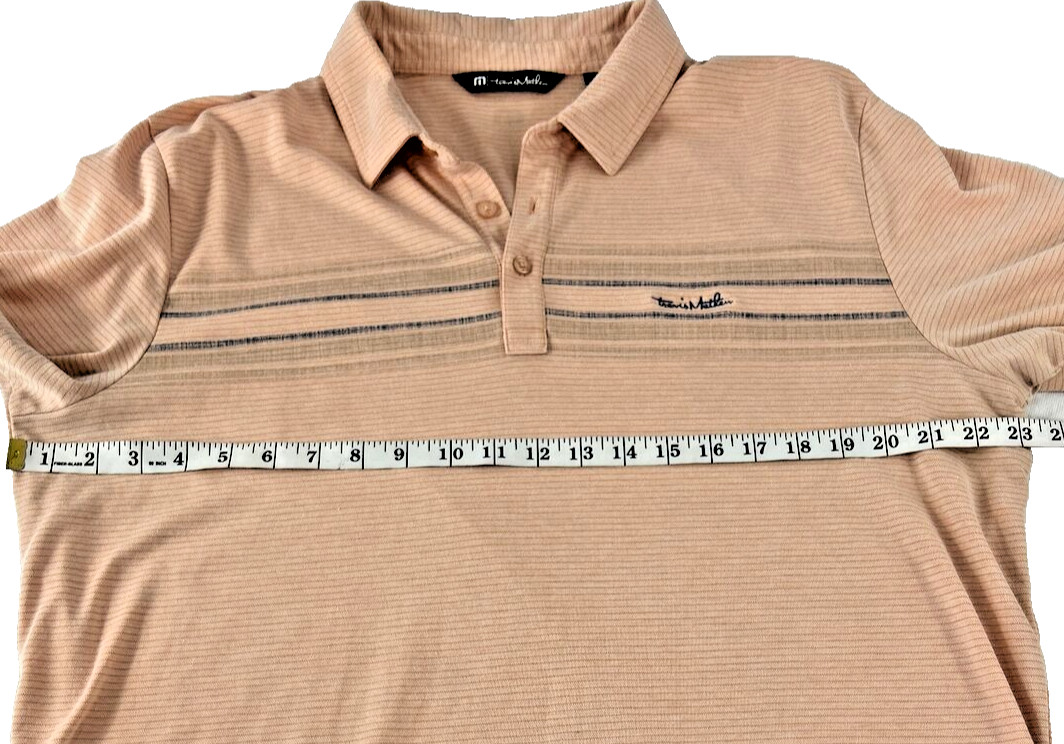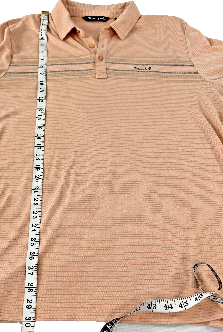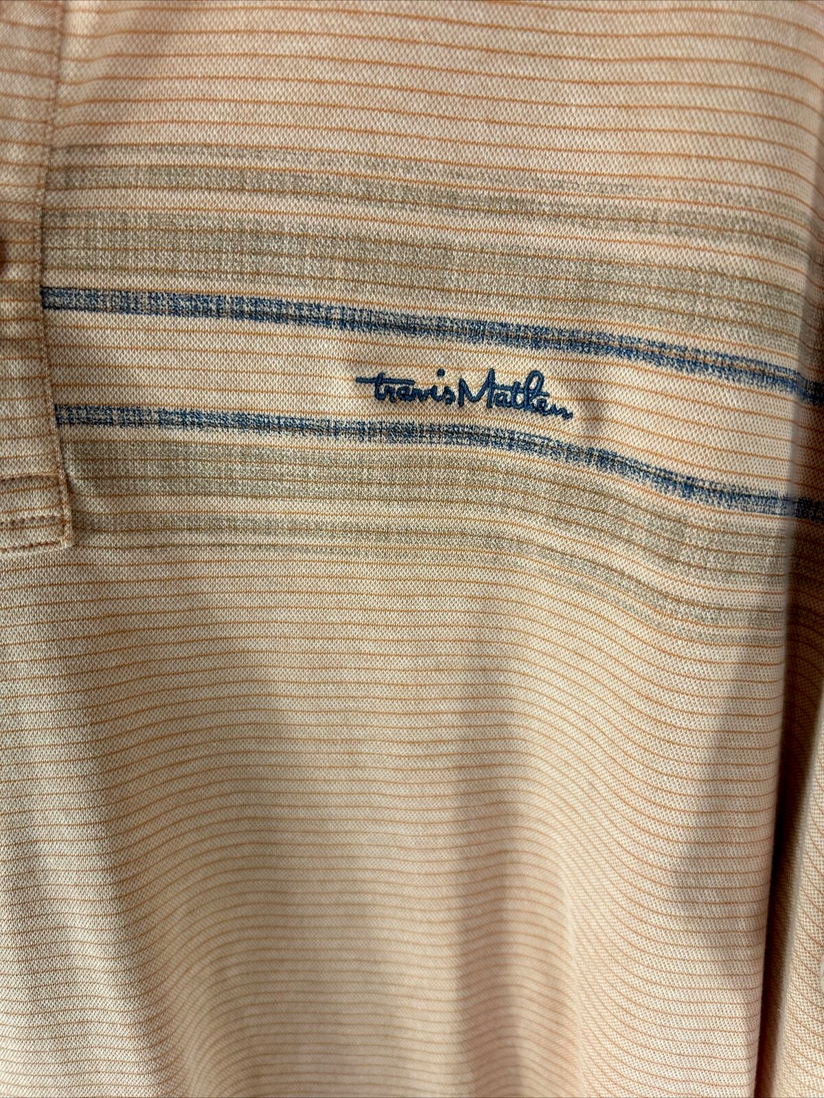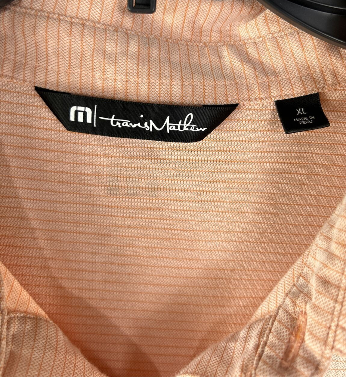 как выглядит Travis Mathew Mens XL Peach Polo Shirt Blue Striped Logo Golf Read фото