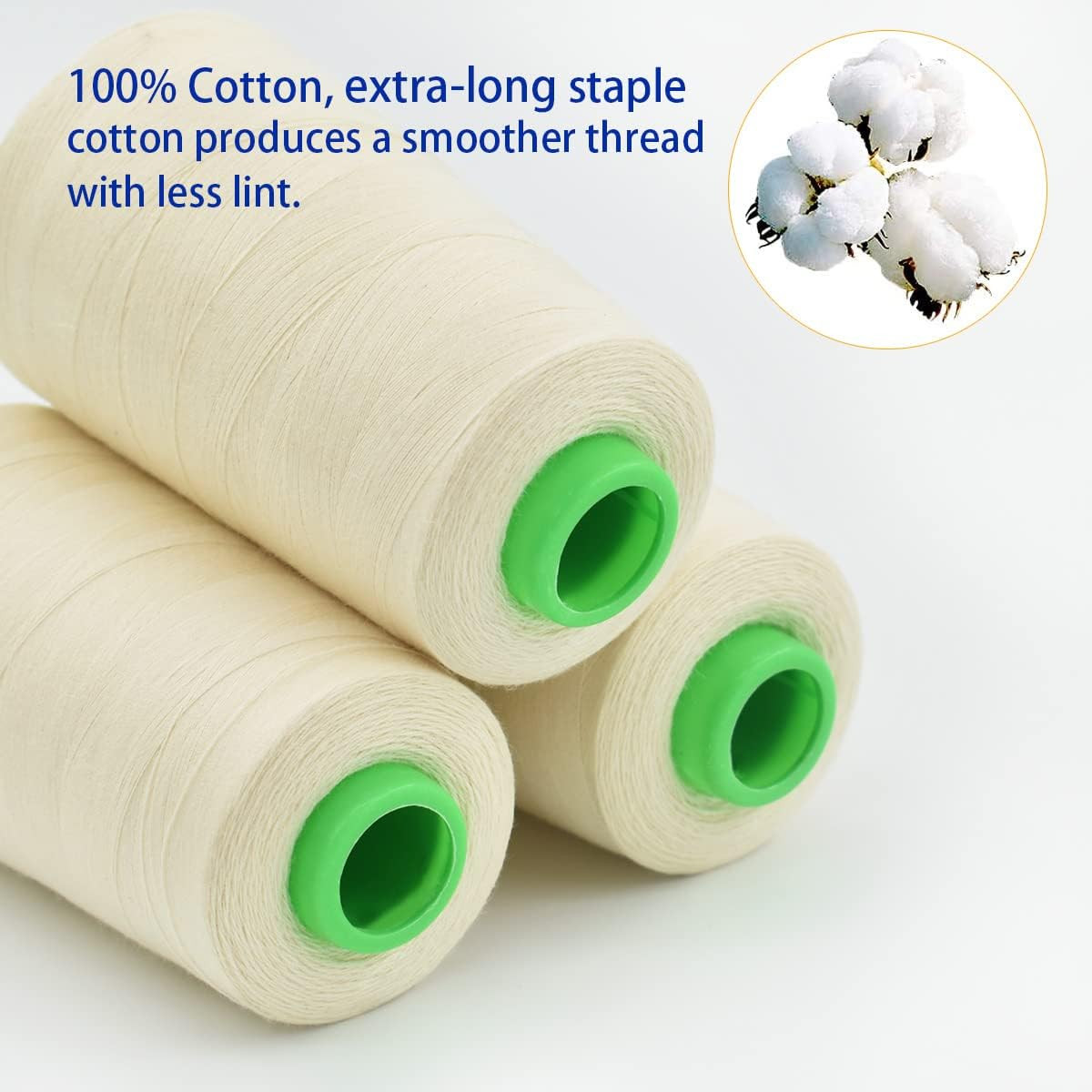 Raw White All Purpose Cotton Thread - 3 Spools, 40/2 Connecting Threads for Serg