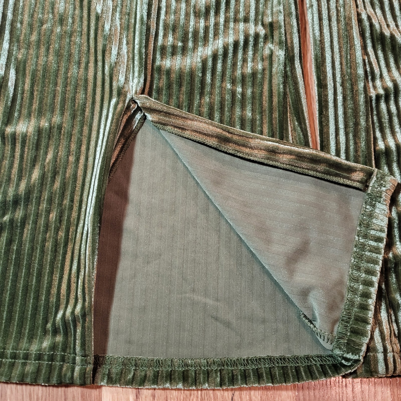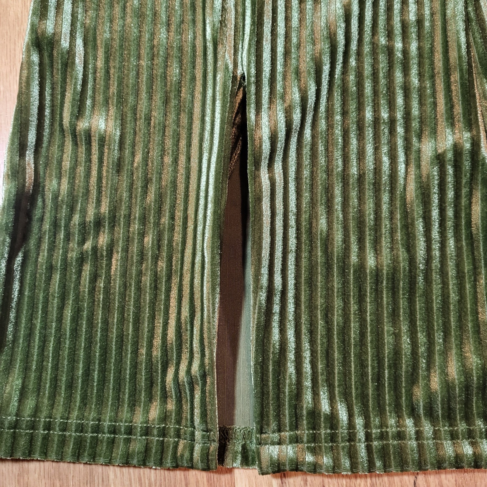 как выглядит Velour Flare Leg Pants Sz Lg Olive Slit Cuff Stripe Disco 60