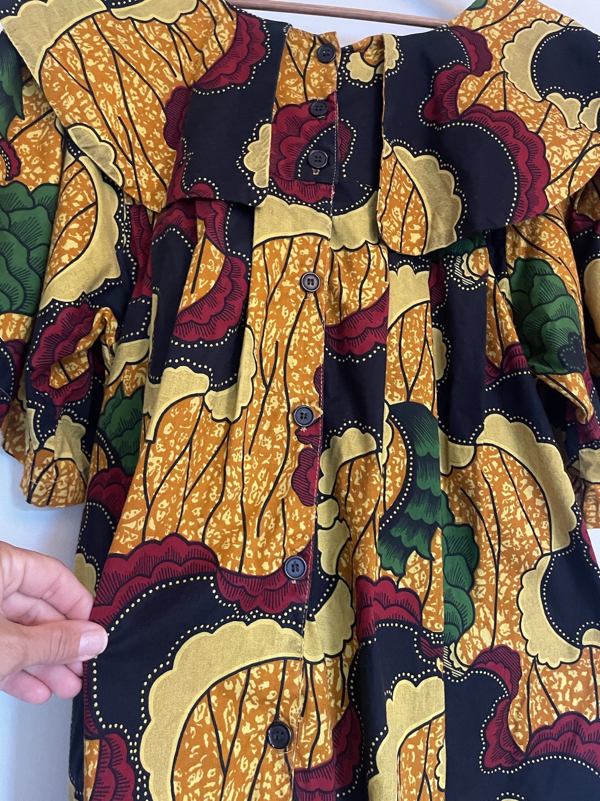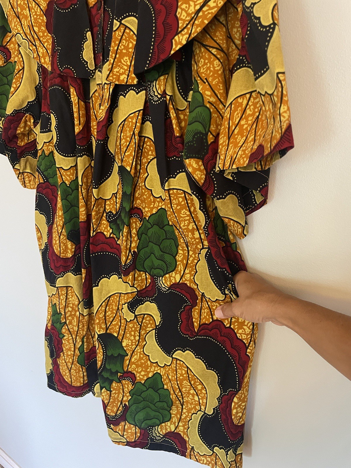 African Wax Print Mini Dress Yellow Red Floral Ruffle Collar Flutter Sleeve. OS.