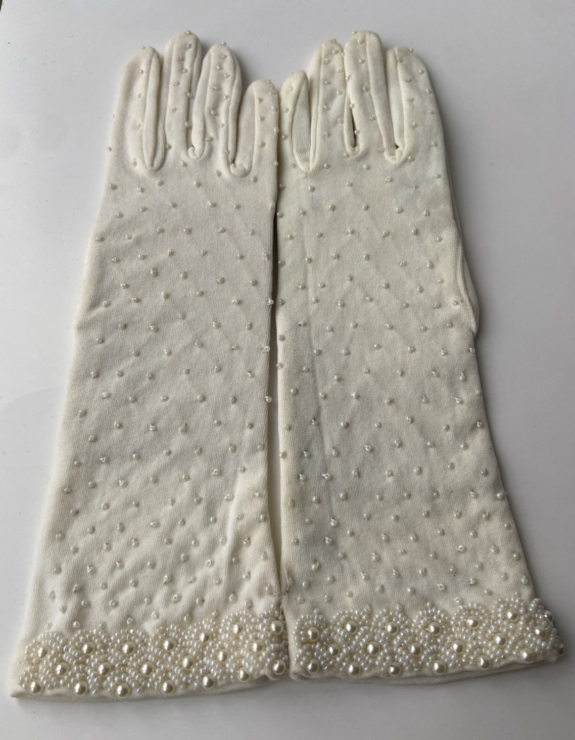 VTG White Evening Gloves Beaded Faux Pearl Wedding Prom Formal Stretchy 1960s