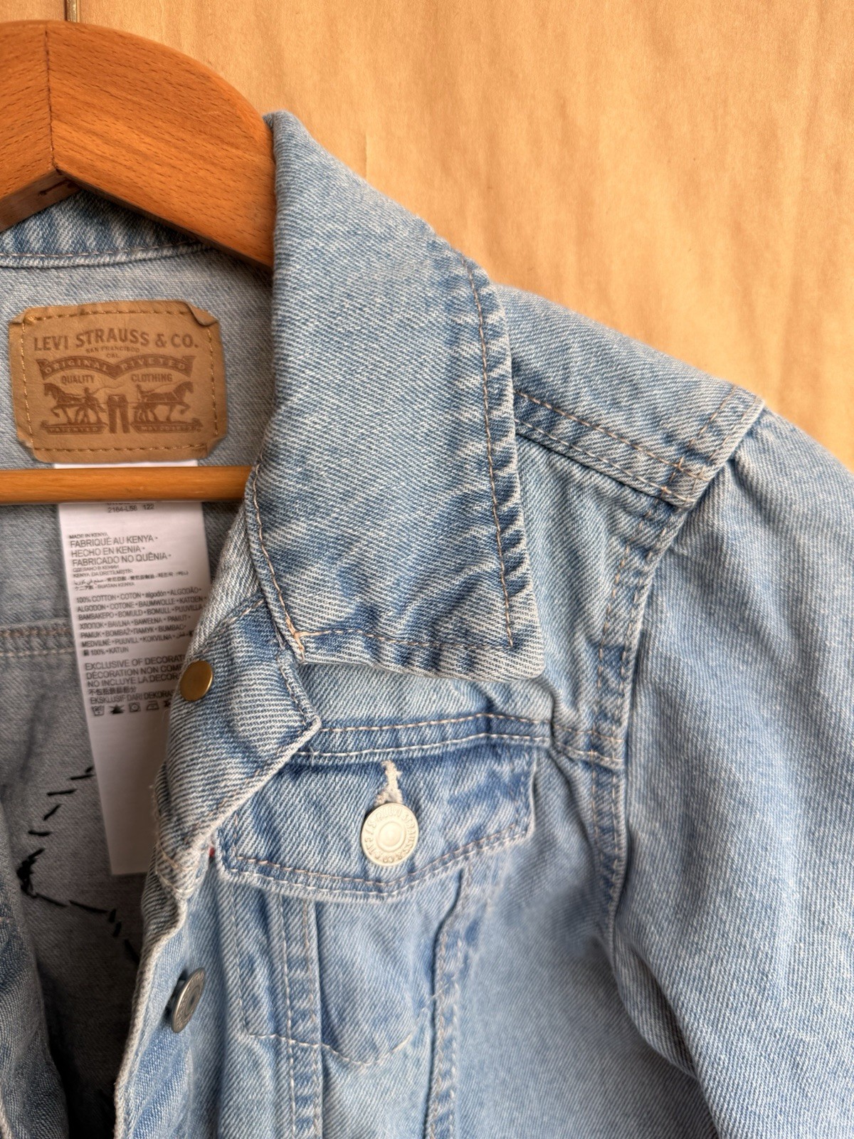 как выглядит Levis Jacket Kids Large Blue Denim Trucker Jacket Light Wash Patches фото