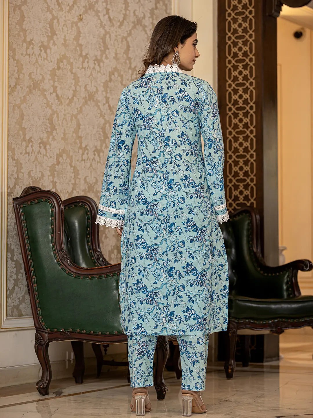как выглядит Light Blue Floral Print Straight Pakistani Style Kurta Trouser And Dupatta Set фото