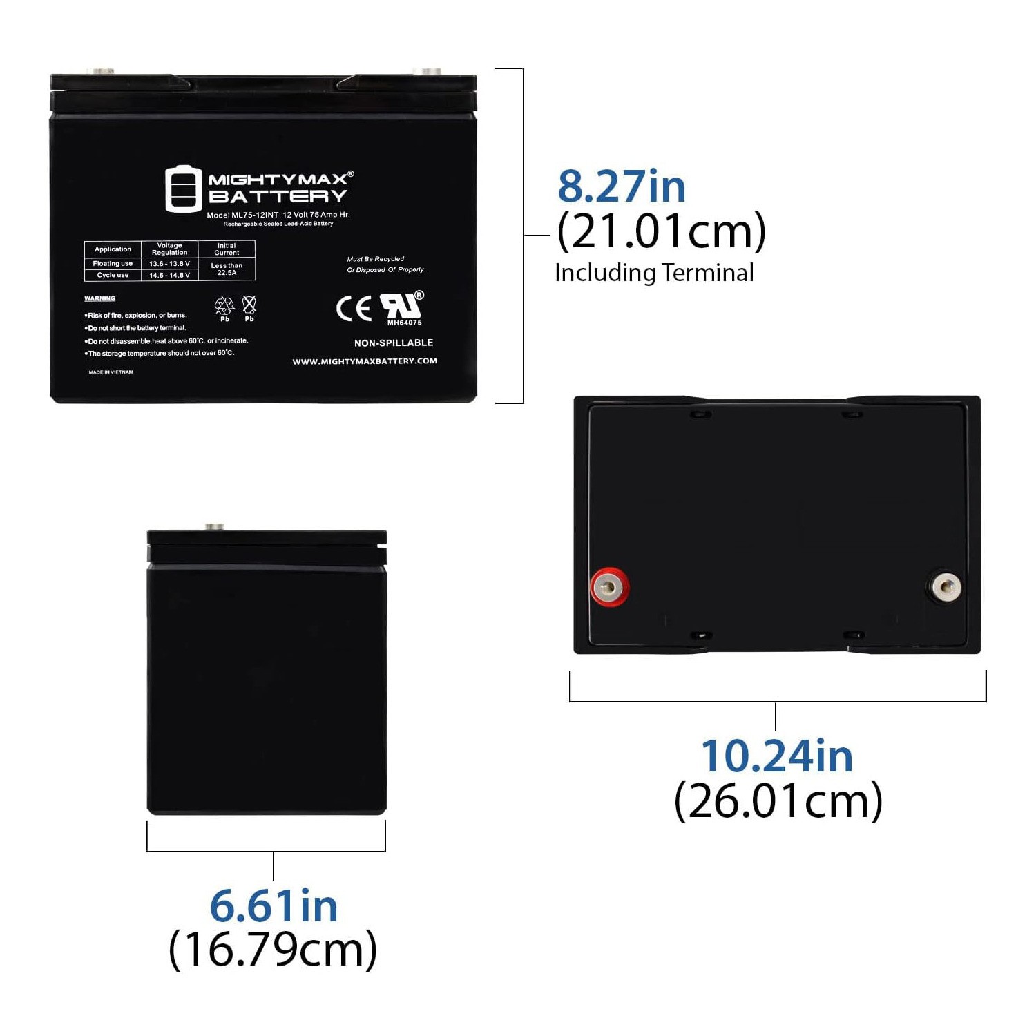 Mighty Max ML75-12INT -12 Volt 75 AH, Internal Thread INT Terminal, Rechargeab