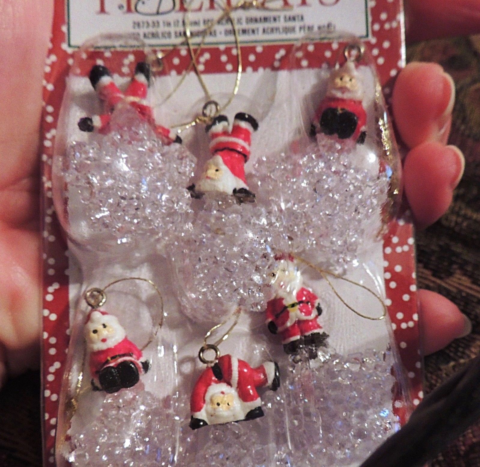 как выглядит 6 PIECE MINIATURE SANTA ORNAMENTS on Icy Stars 6 POSITIONS 1.75" T X 1" W NIP фото