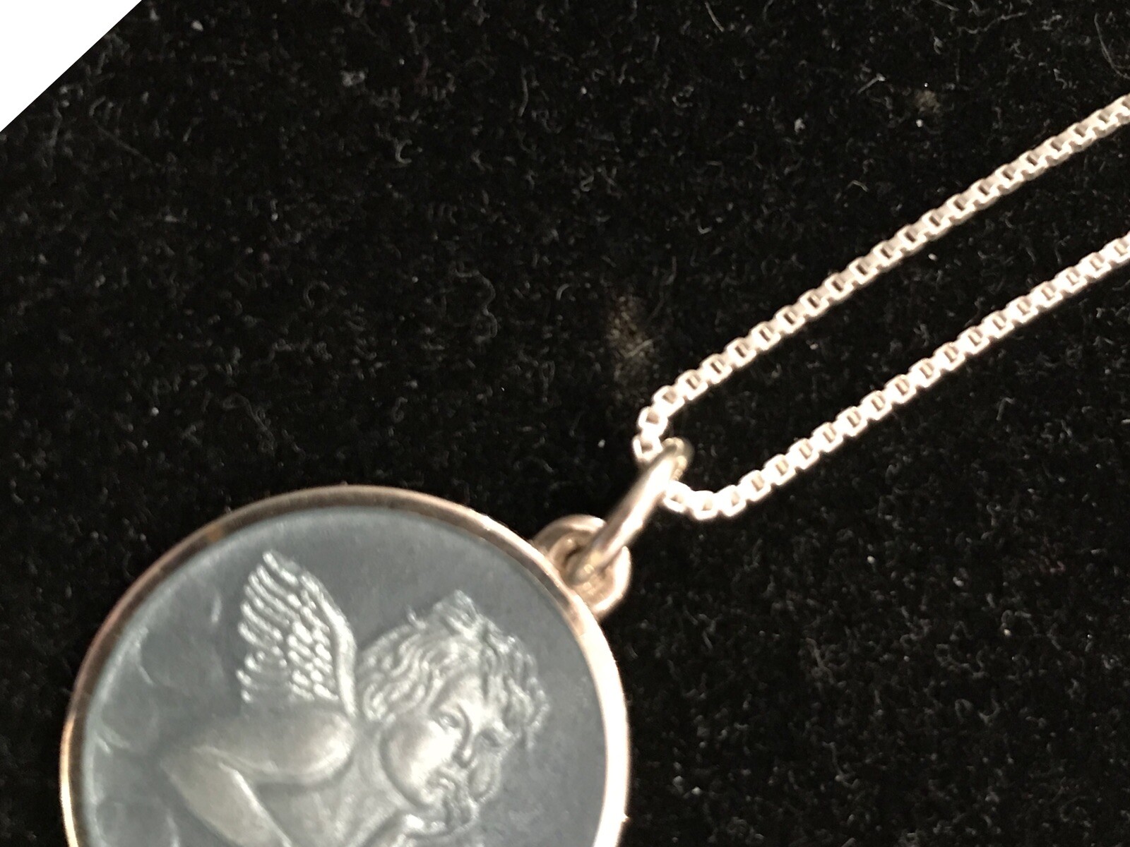 как выглядит Guardian Angel Pendant Necklace-Guilloche Enamel on Sterling Silver 1 Inch GREY фото