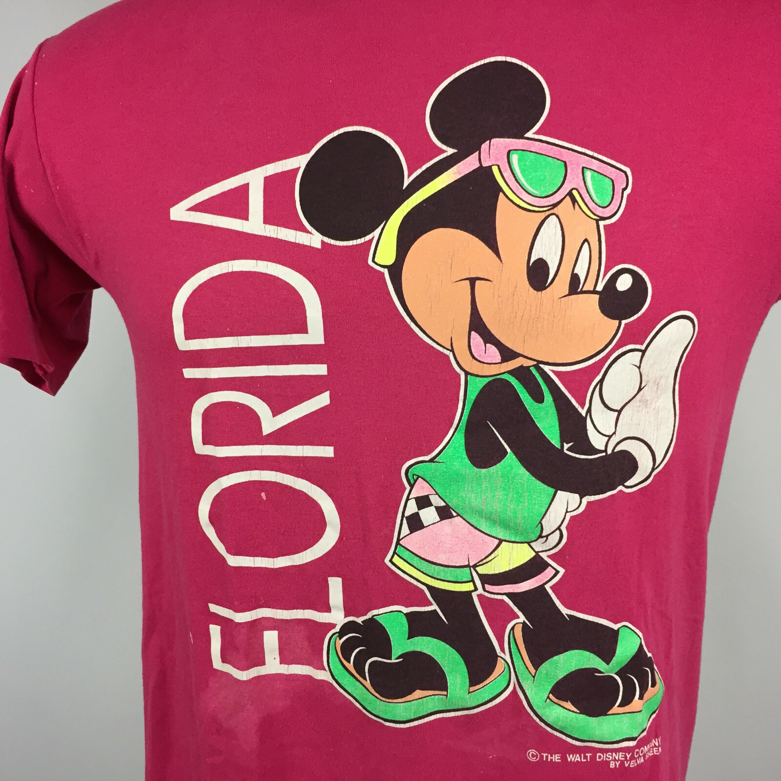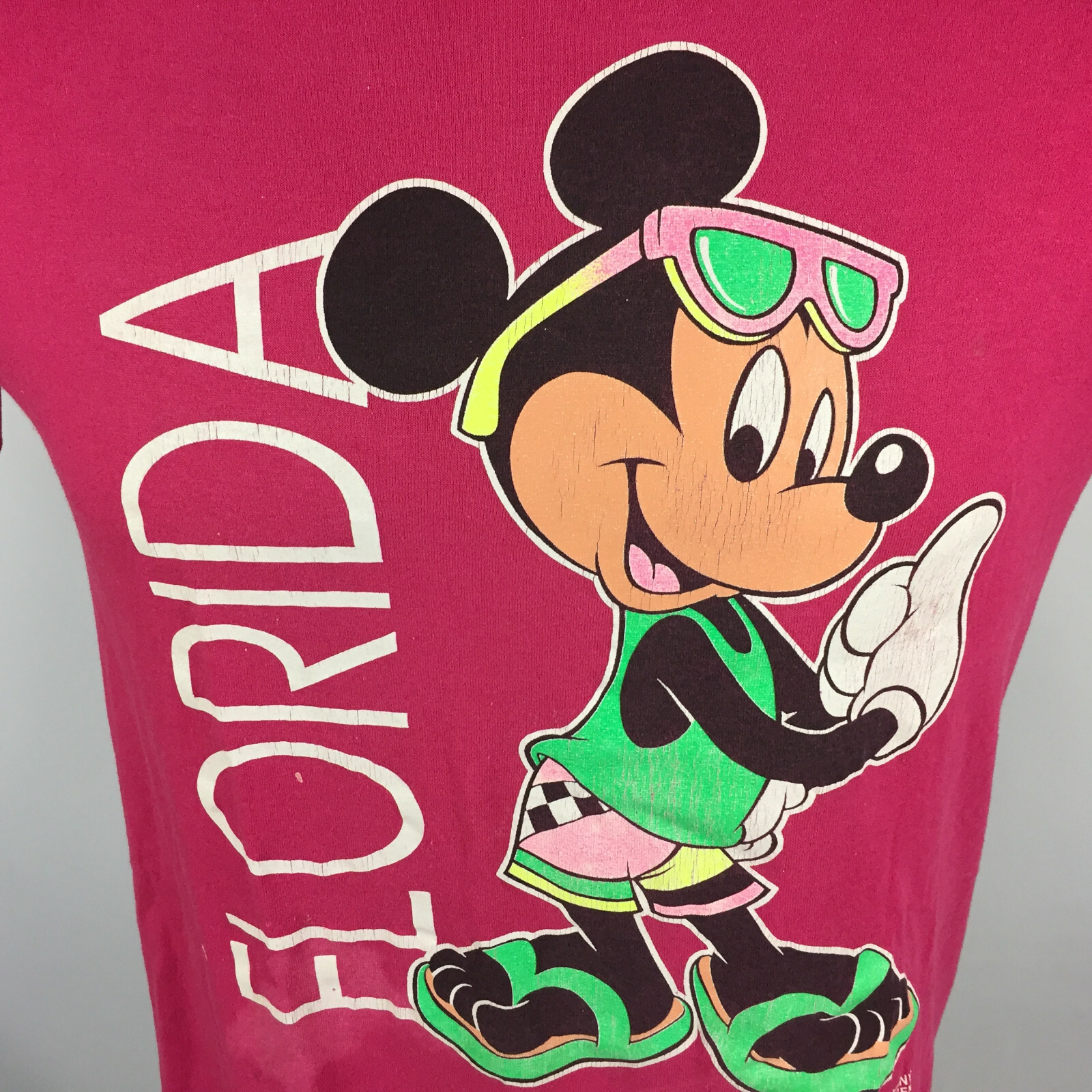 Vintage 80s 90s Florida Mickey Mouse Neon Hot Pink Distressed Thin T Shirt USA