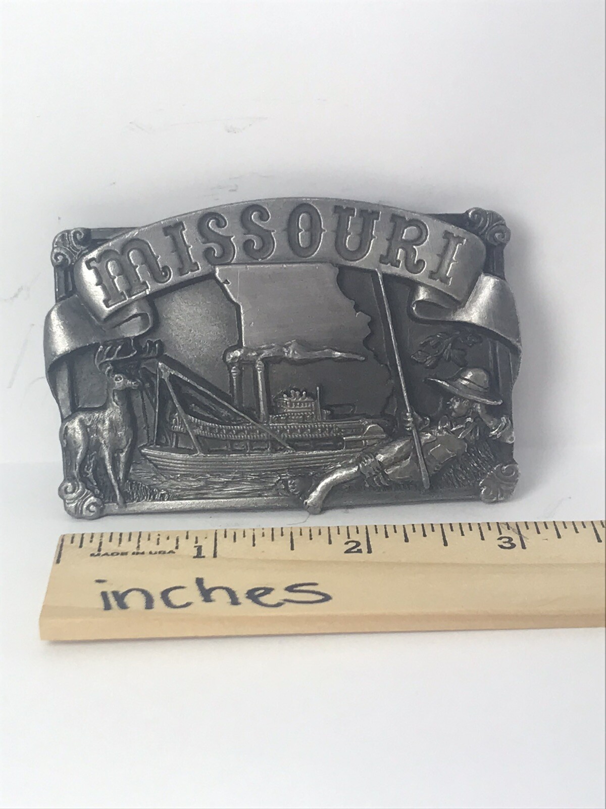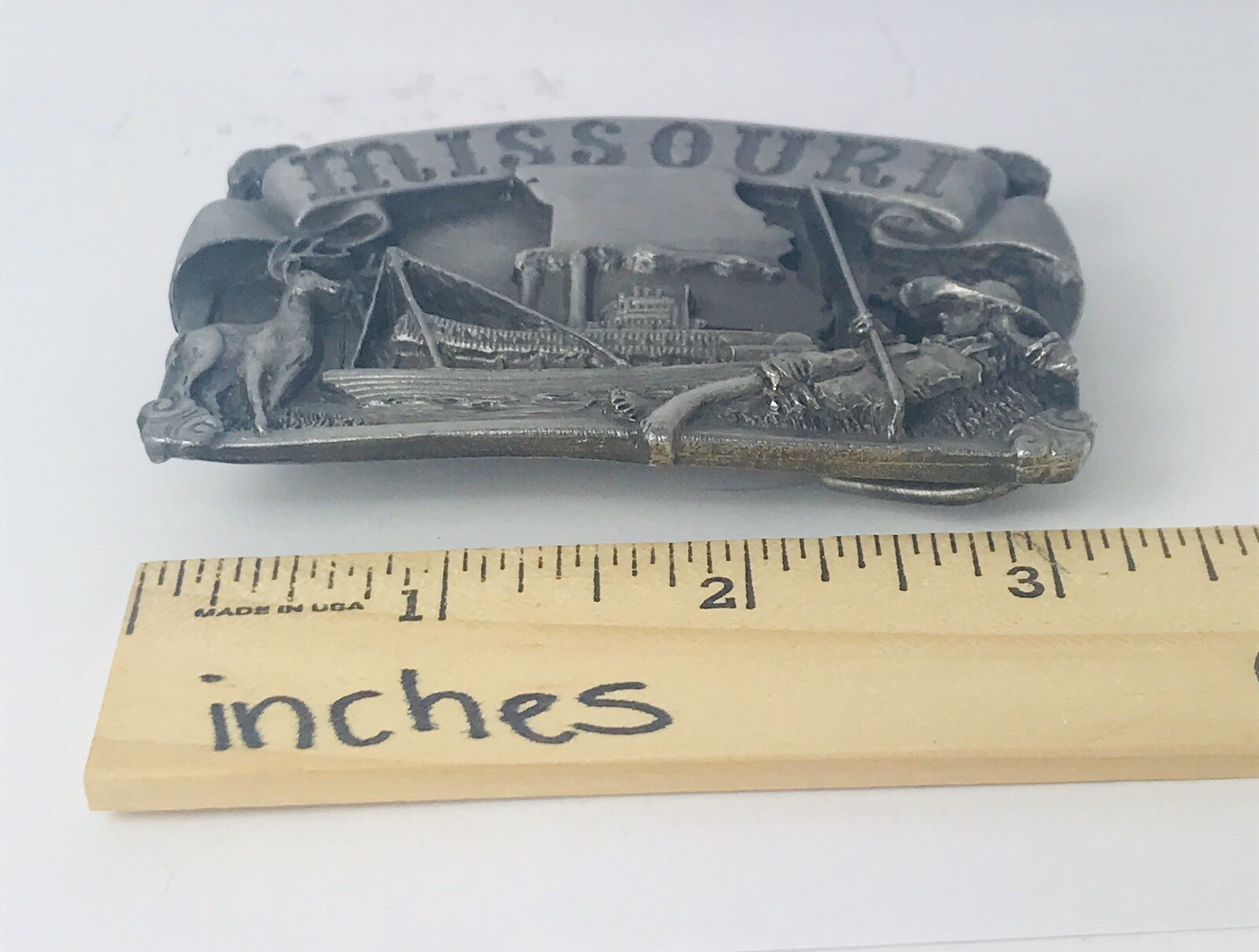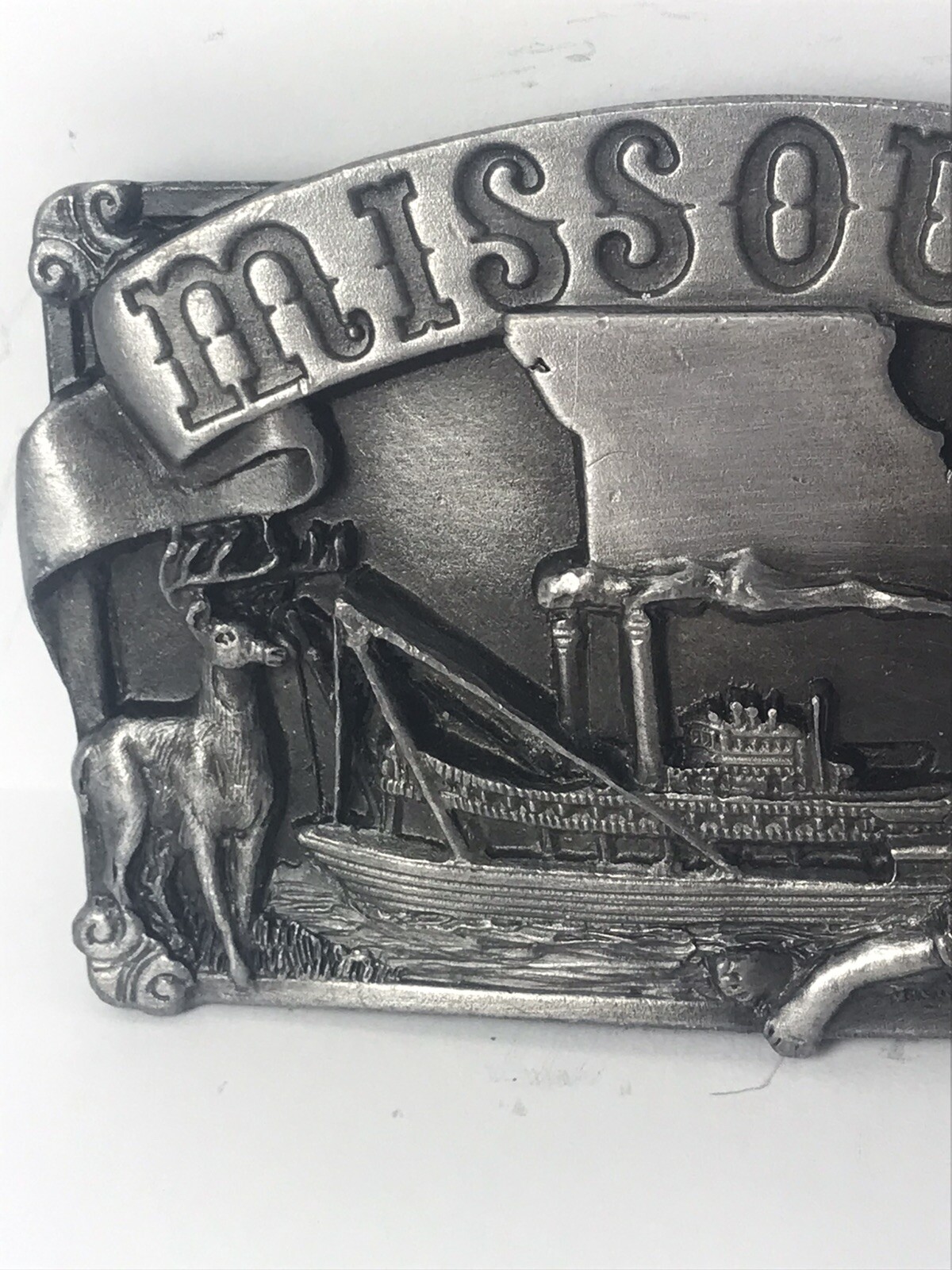 как выглядит VINTAGE 1984 SISKIYOU BELT BUCKLE MISSOURI STEAMBOATS HUNTING FISHING фото