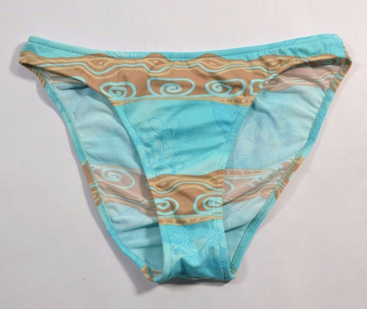 De La Mer AT LOW RISE Blue Tan Striped Swirl Flower Swim Junior's Bikini Bottoms