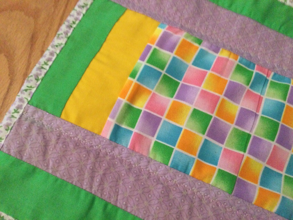 Quilted Table topper or wall decoration green yellow, purple, 16 x 13