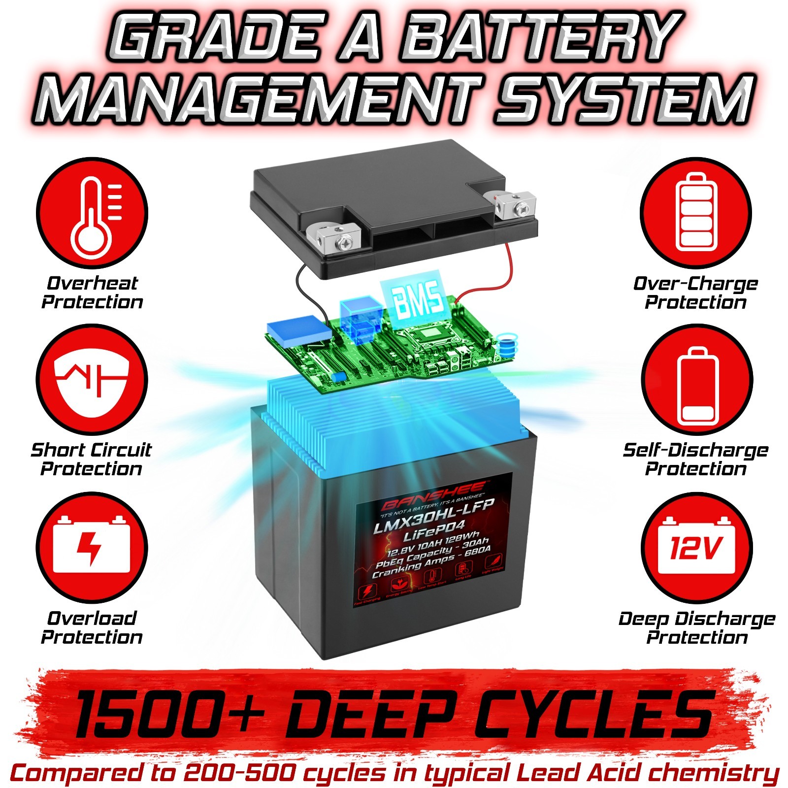 • Banshee YTX30L-BS High Performance Maintenance Free LifePO4 Motorcycle Battery