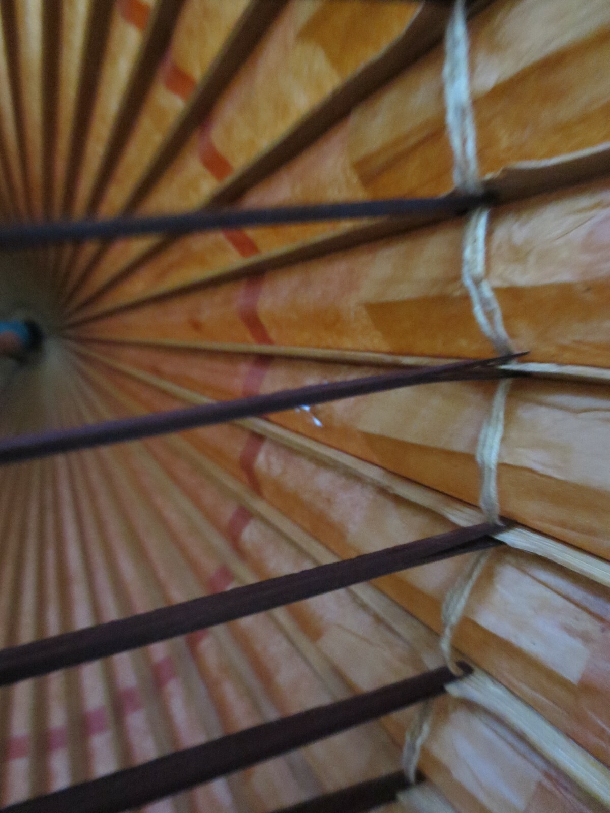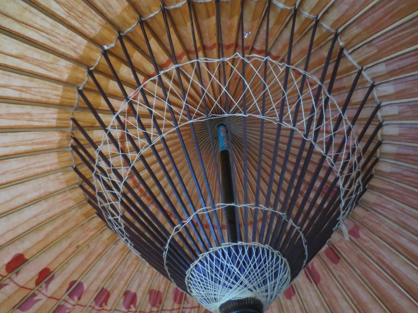 как выглядит Vtg JAPANESE UMBRELLA PARASOL Lacquer Rice Paper Bamboo Wood Orange Spiral 37" фото