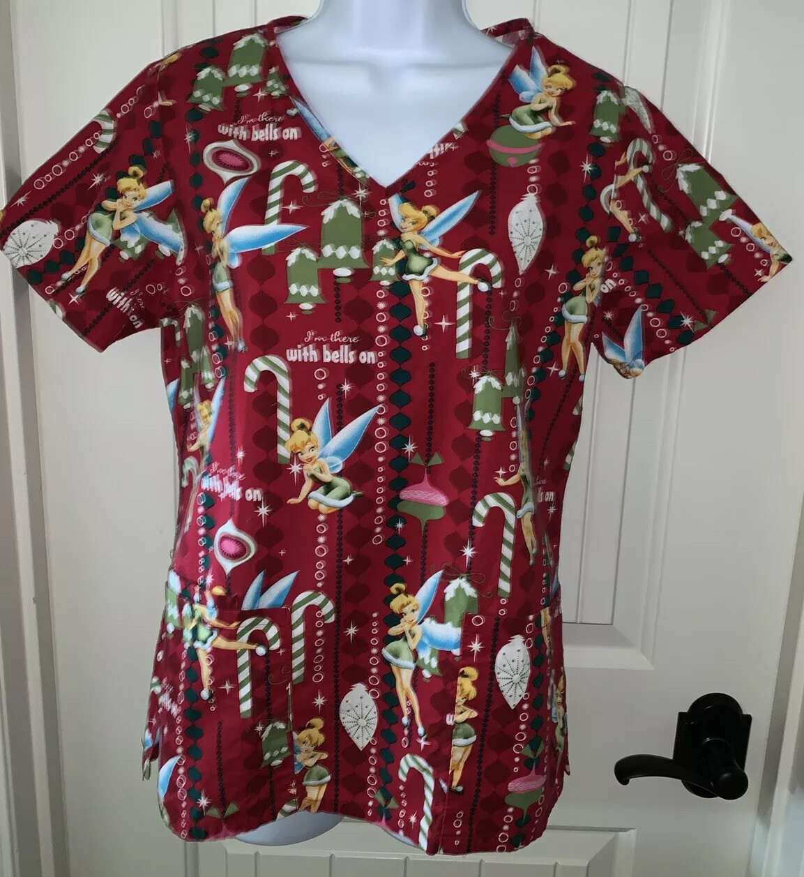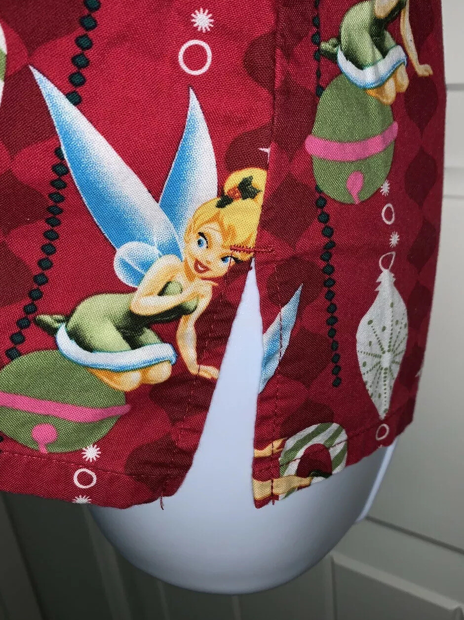 Disney Scrub Top Holiday Ornaments Tinkerbell Red Bells Ornaments Sz XS EUC