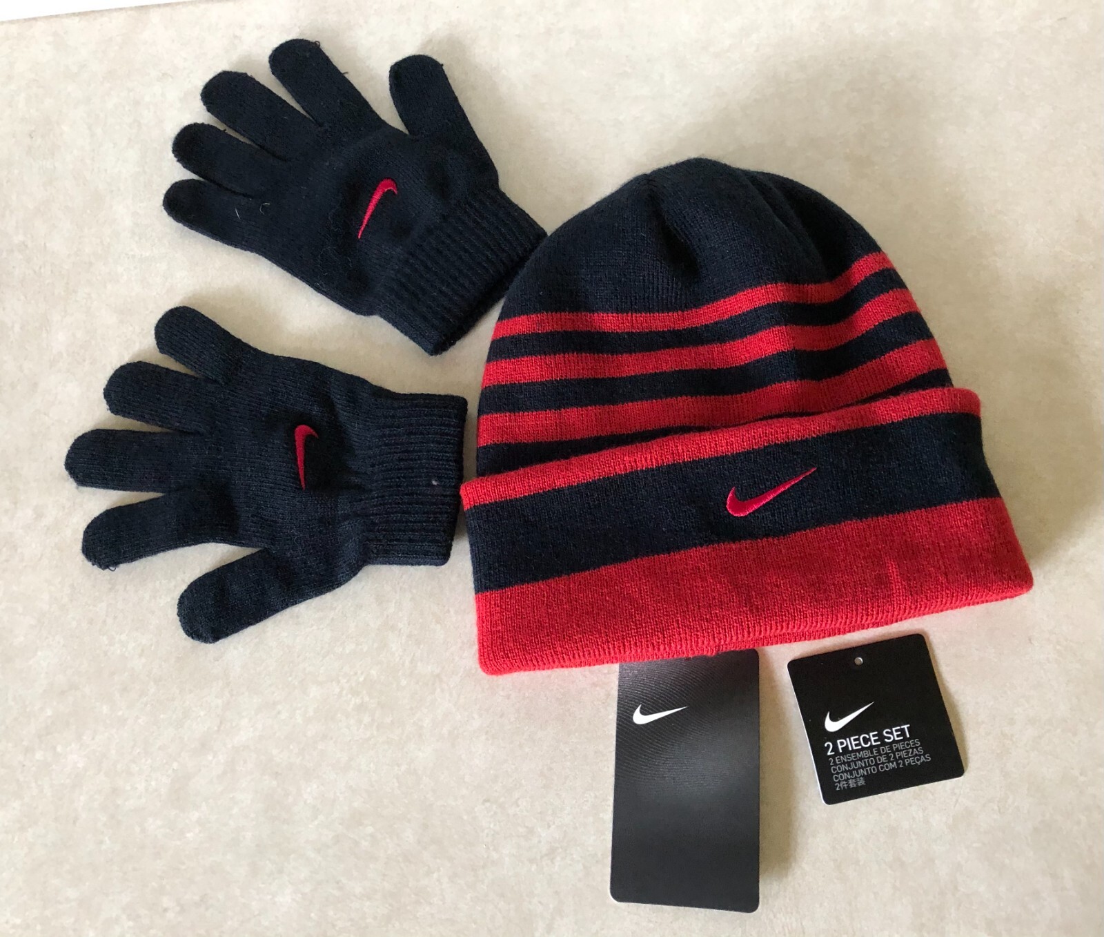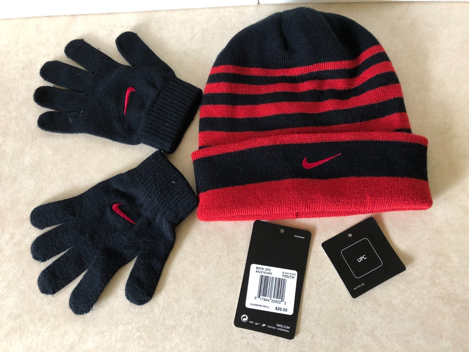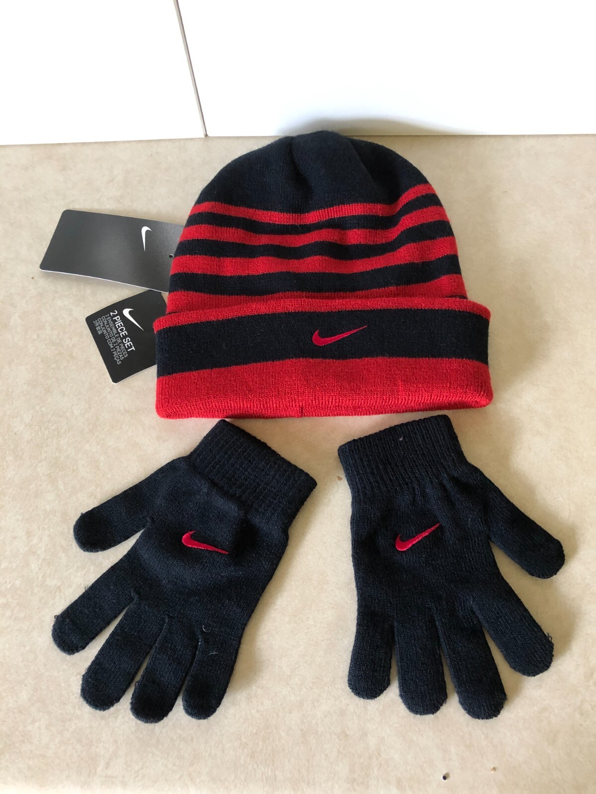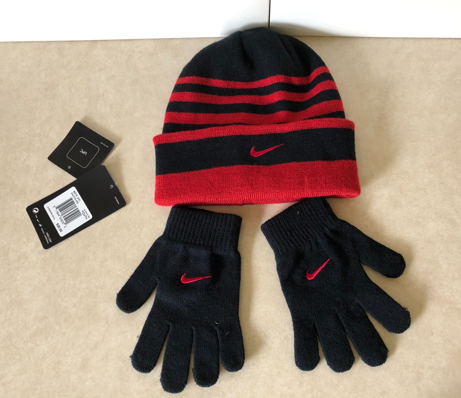 NWT Nike Youth Reversible Knit Beanie Hat Gloves Set Black/Red One Size