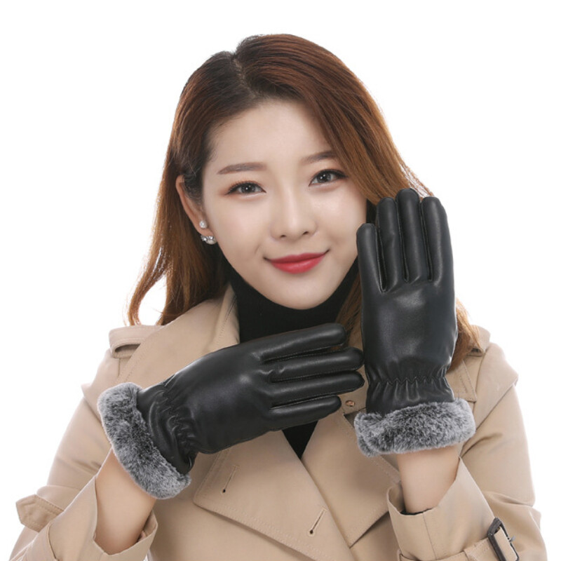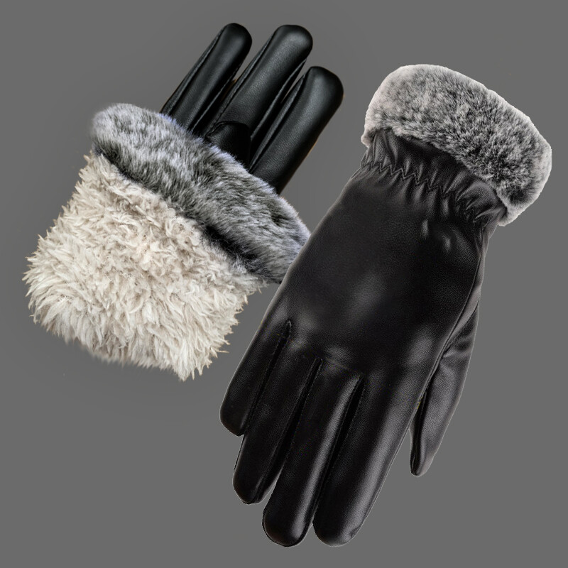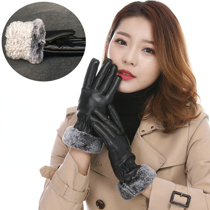 Women PU Gloves Faux Fur Trim Fleece Lined Thicken Thermal Riding Driving Winter