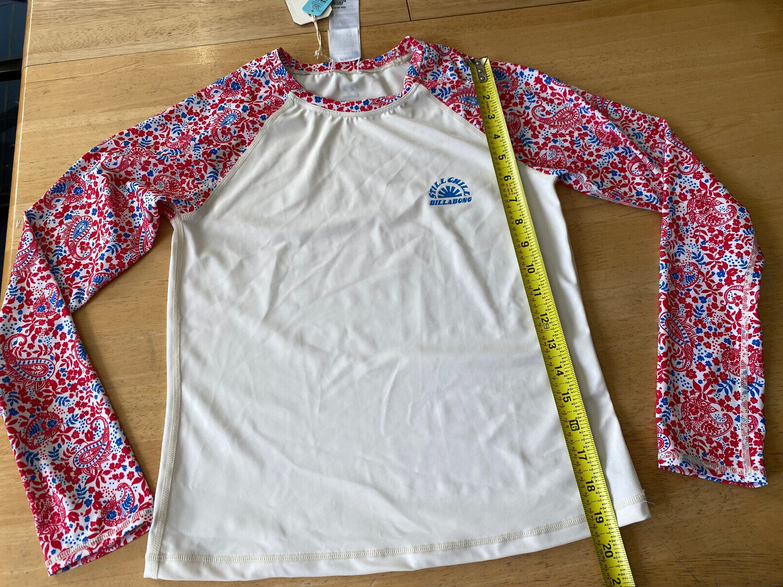 как выглядит BILLABONG Rash Guard Swim Top Girls Youth 14 White w/ Red/Blue Print Long Sleeve фото