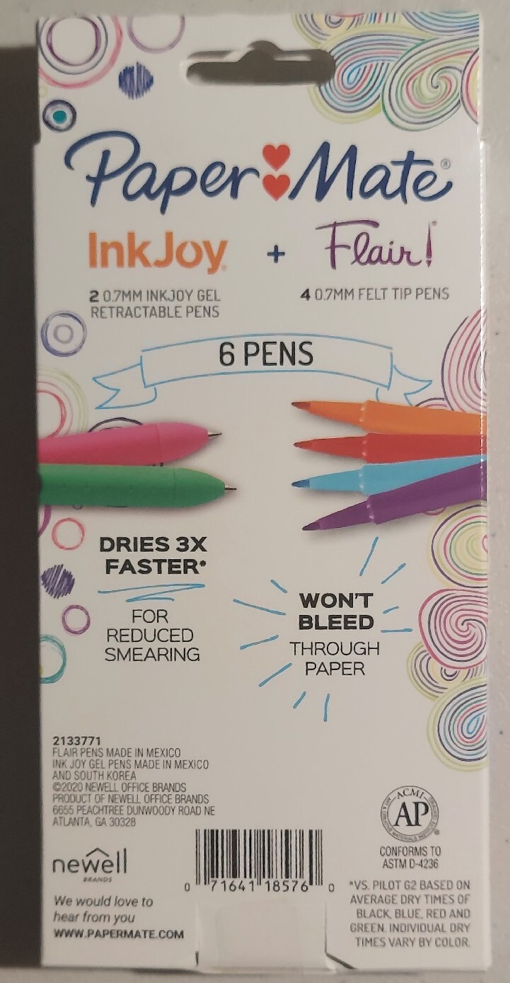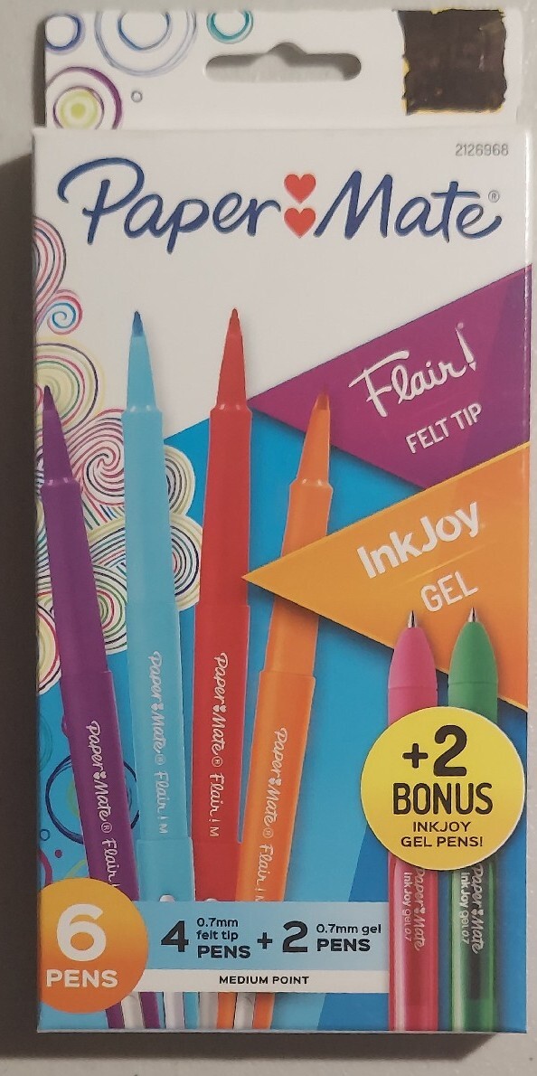 Paper Mate 6 Color Pens 4 Felt Tip 2 Gel Ink Medium Point 0.7 mm