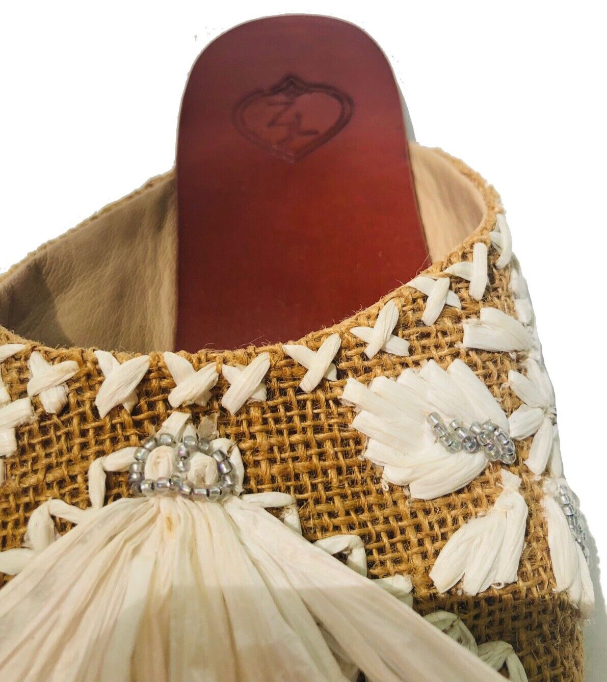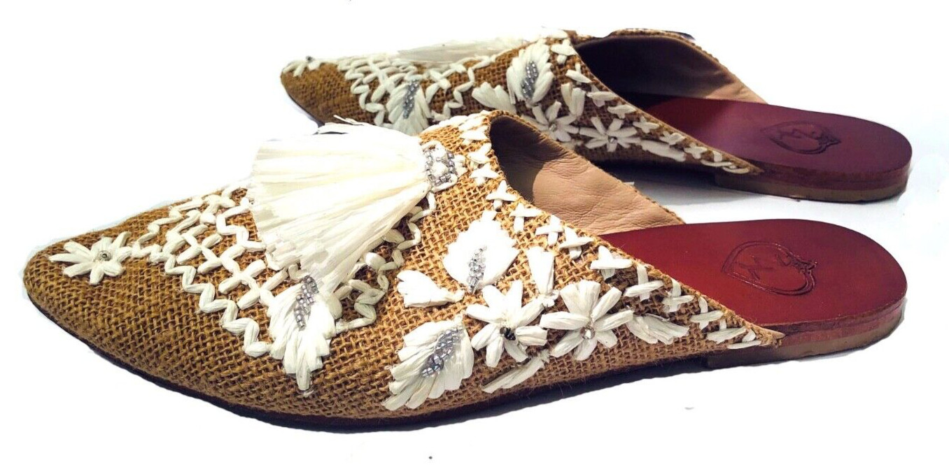Anthropologie Z L India Tan Jute Burlap Ivory Embroidered Boho Flats Slides 37
