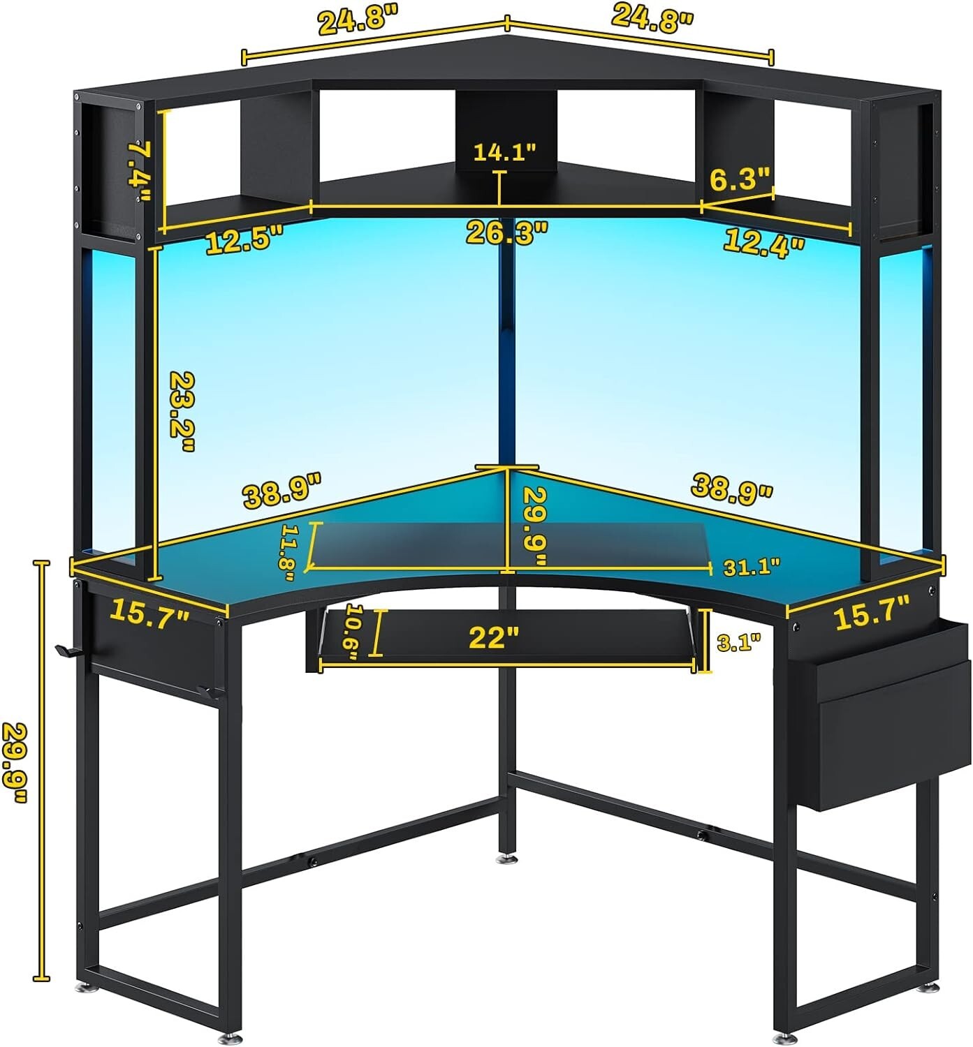 Corner Desk, Small Computer Desk with Hutch LED Lights for Home Office Black