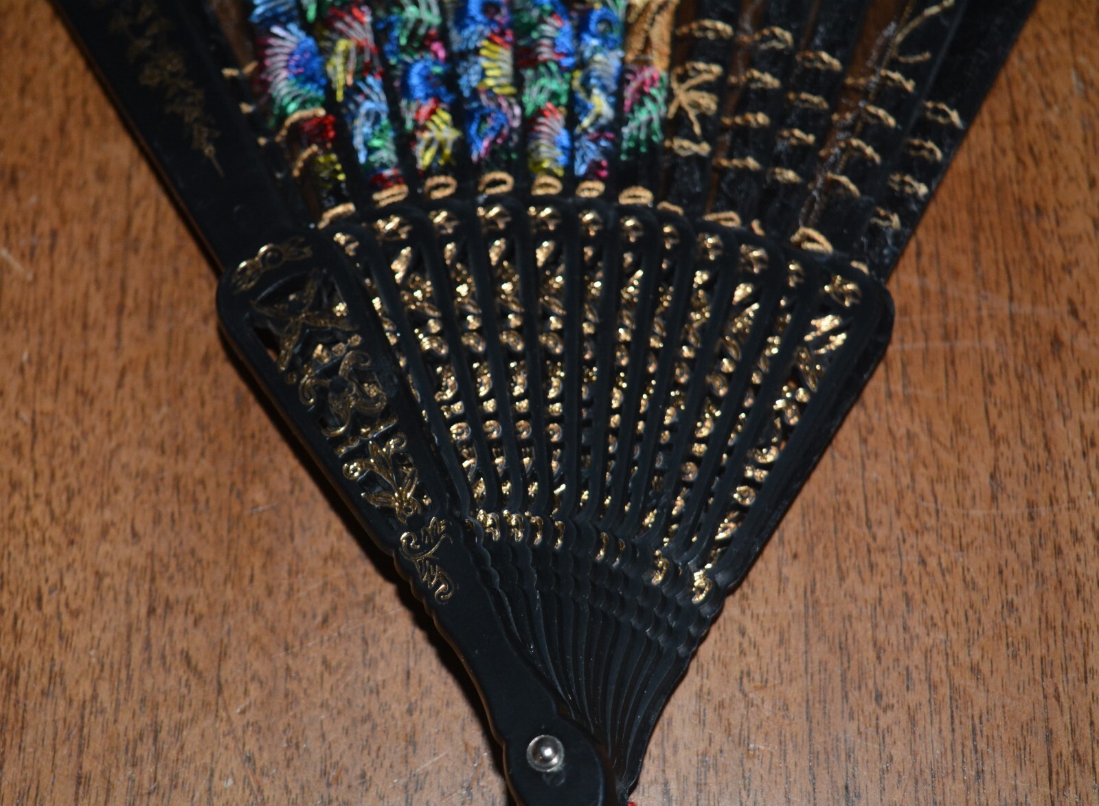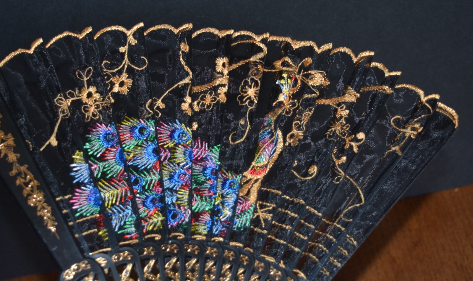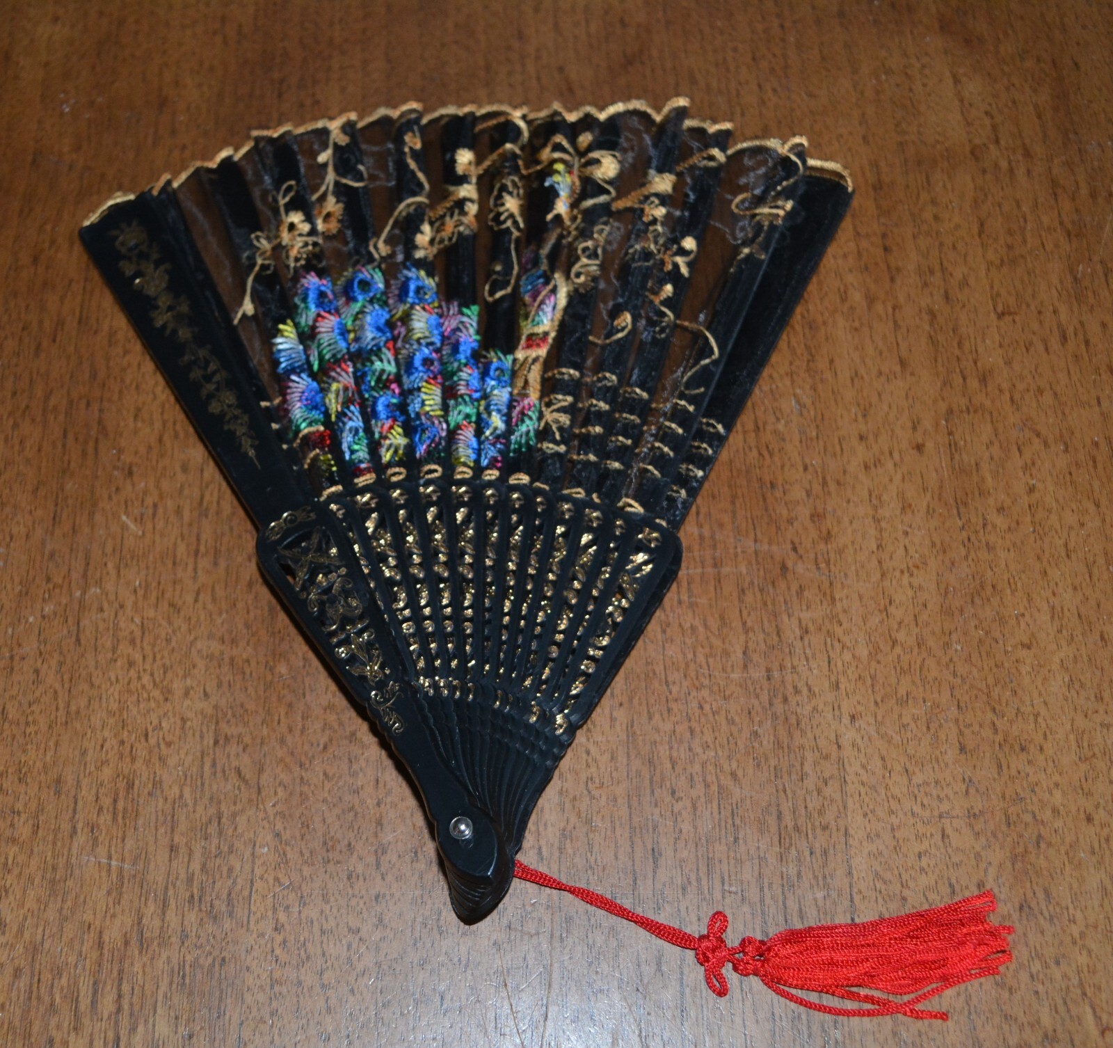 как выглядит VTG Plastic Folding Hand Fan Embroidered Bright Peacock фото