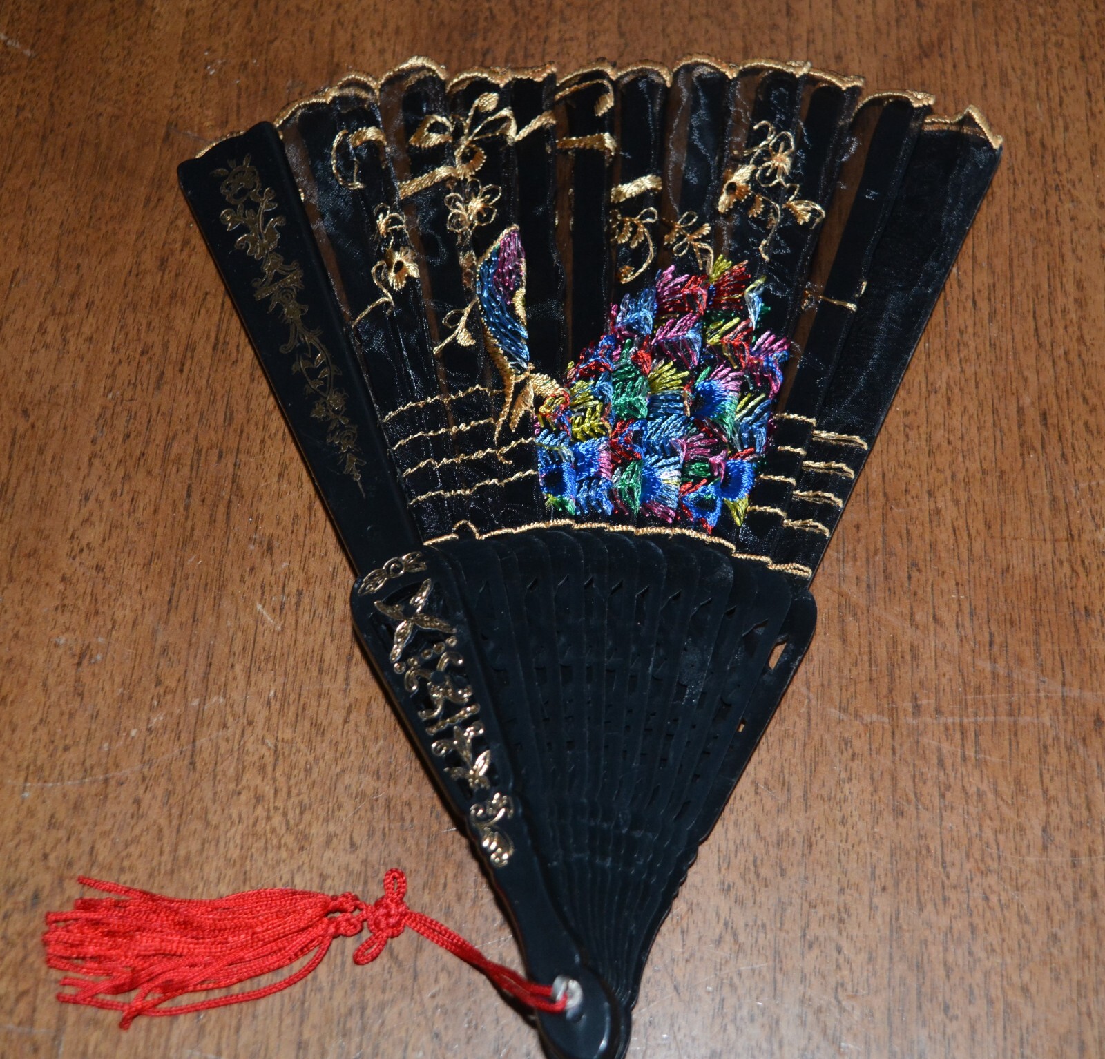 VTG Plastic Folding Hand Fan Embroidered Bright Peacock