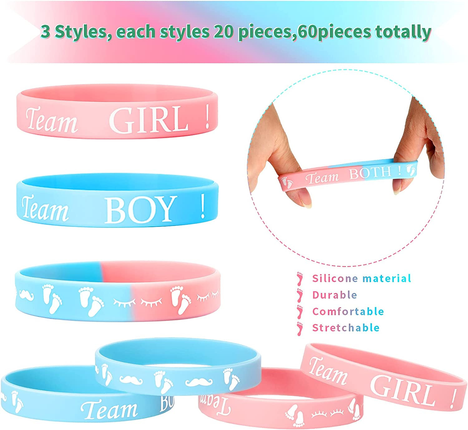 60 Pieces Gender Reveal Bracelets, Team Boy Silicone Wristbands Team Girl Gender