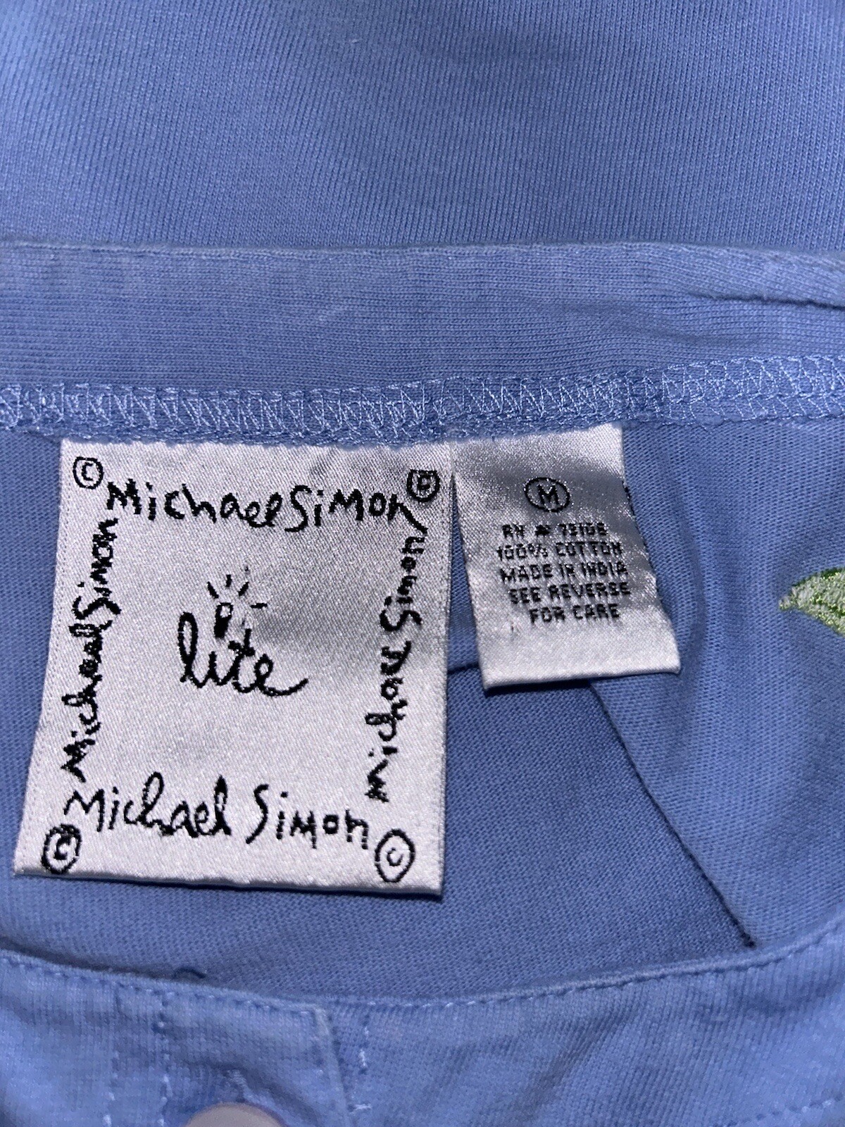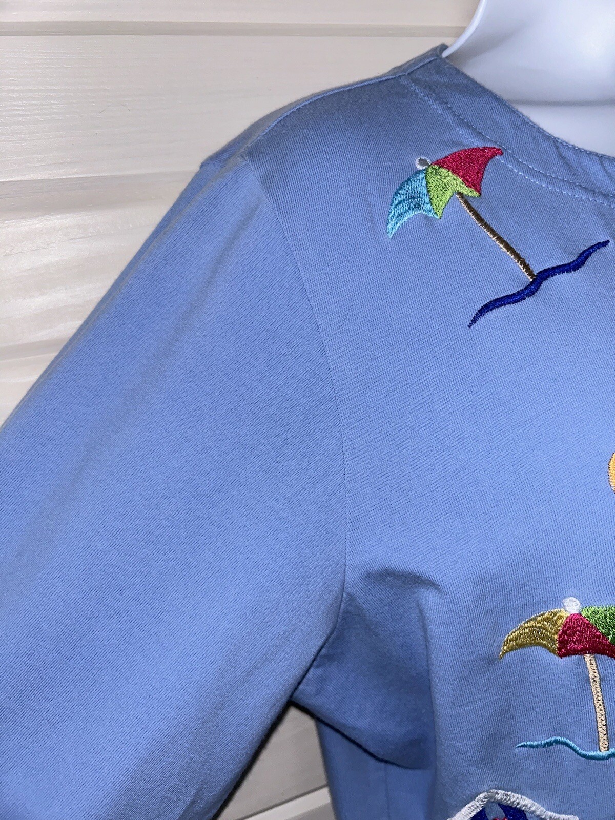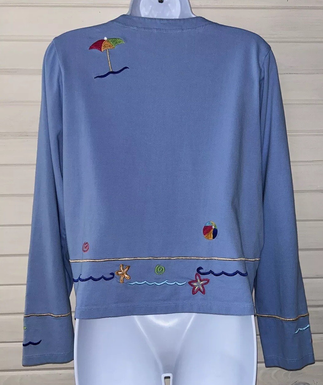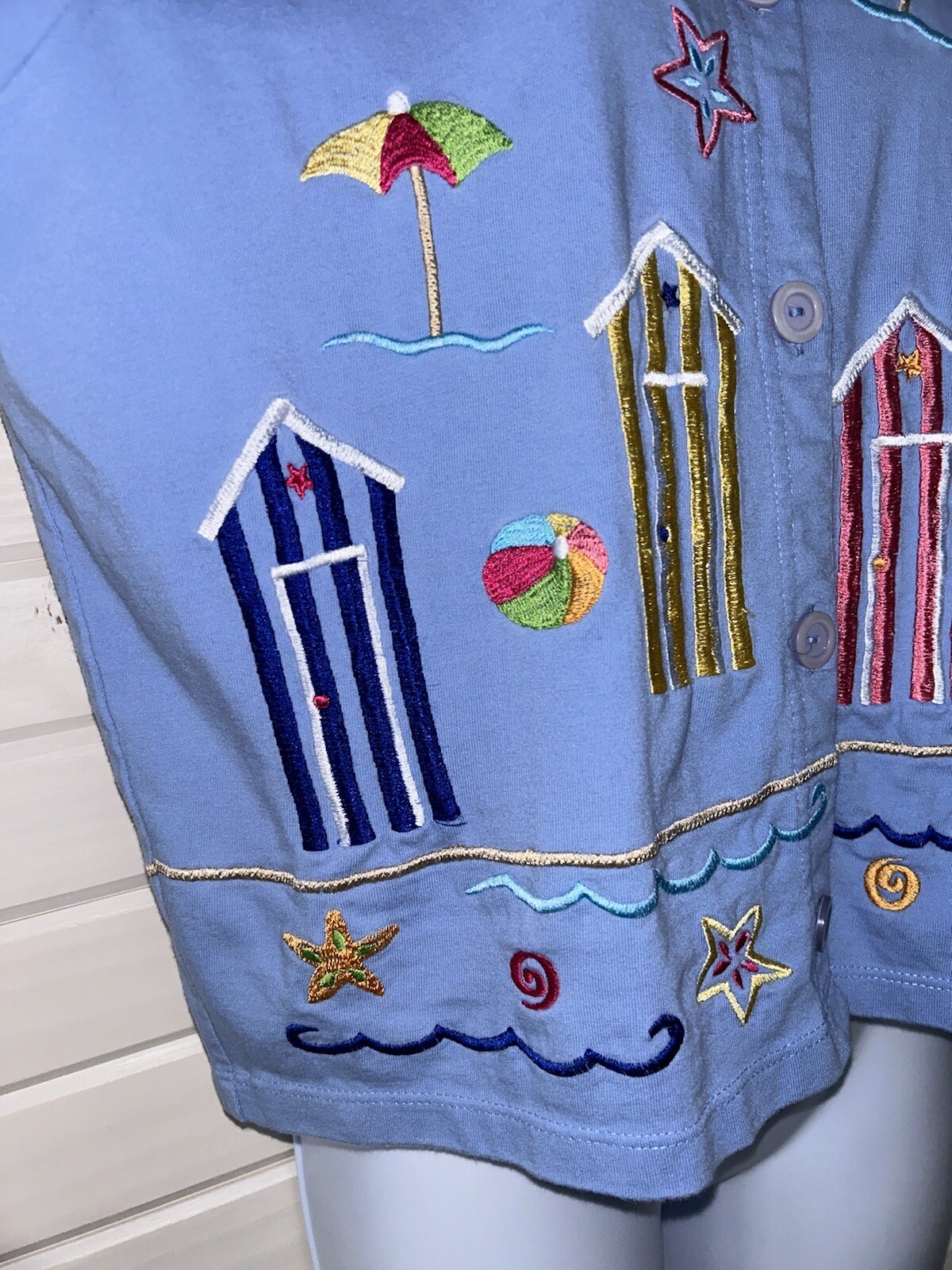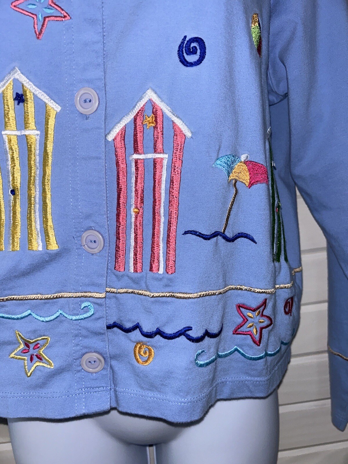 VTG Michael Simon Lite Sz MEDIUM Blue Beach Cardigan Cotton Cabanas Embroidered