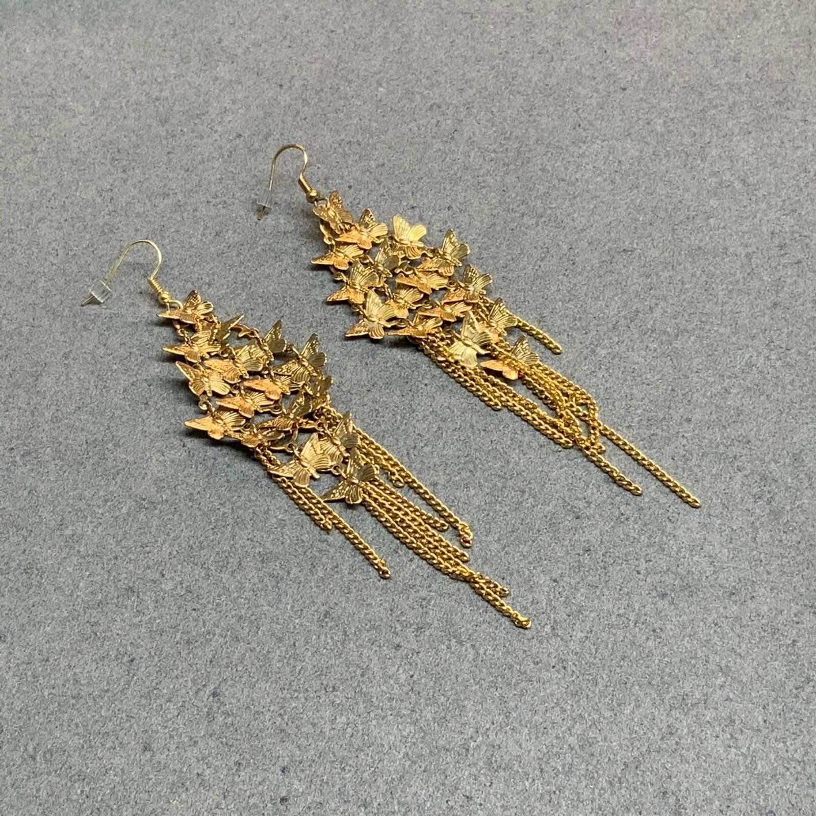 как выглядит Butterfly Chandelier Pierced Earrings Gold Chain Fringe Dangle Delicate Retro фото