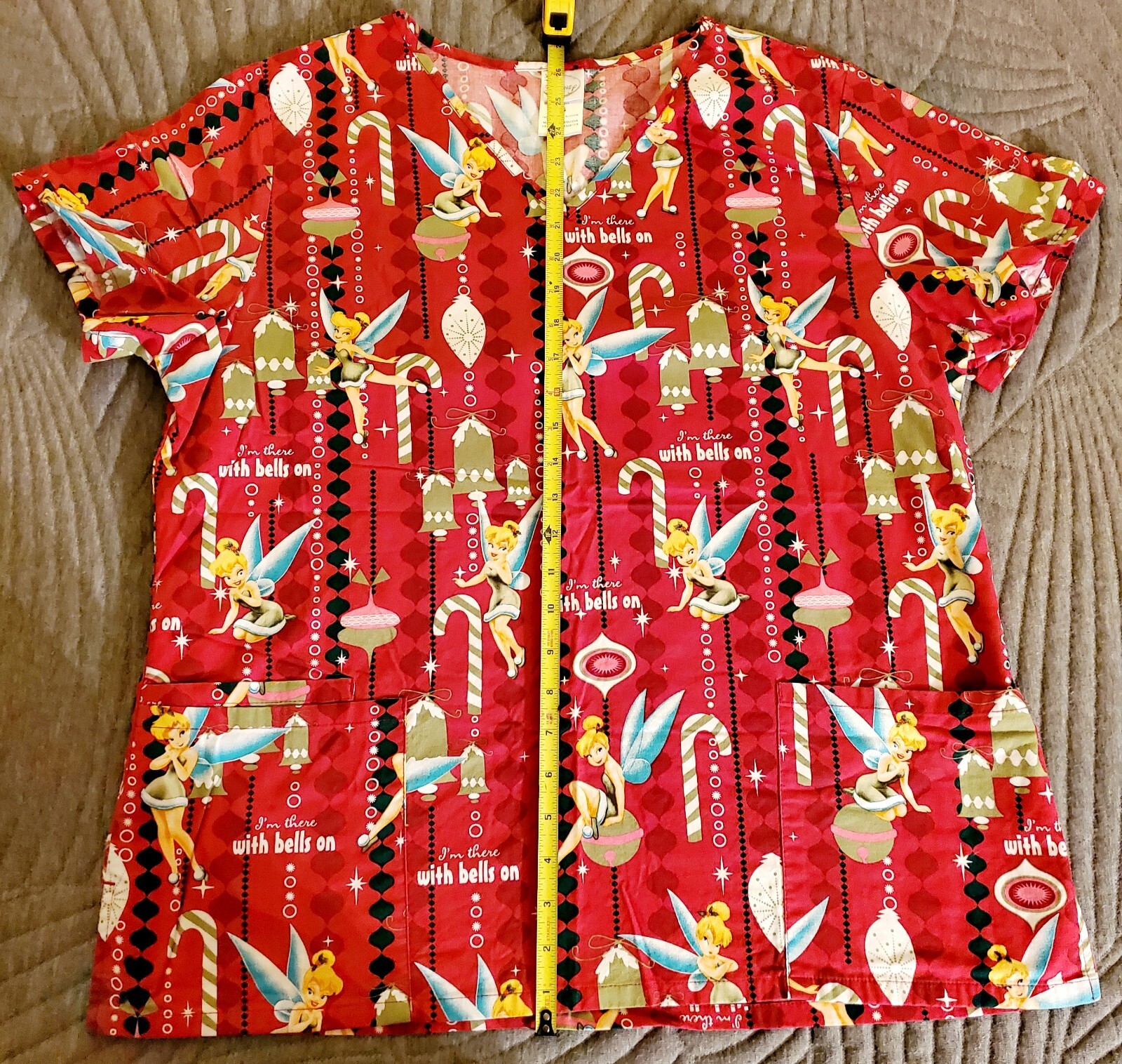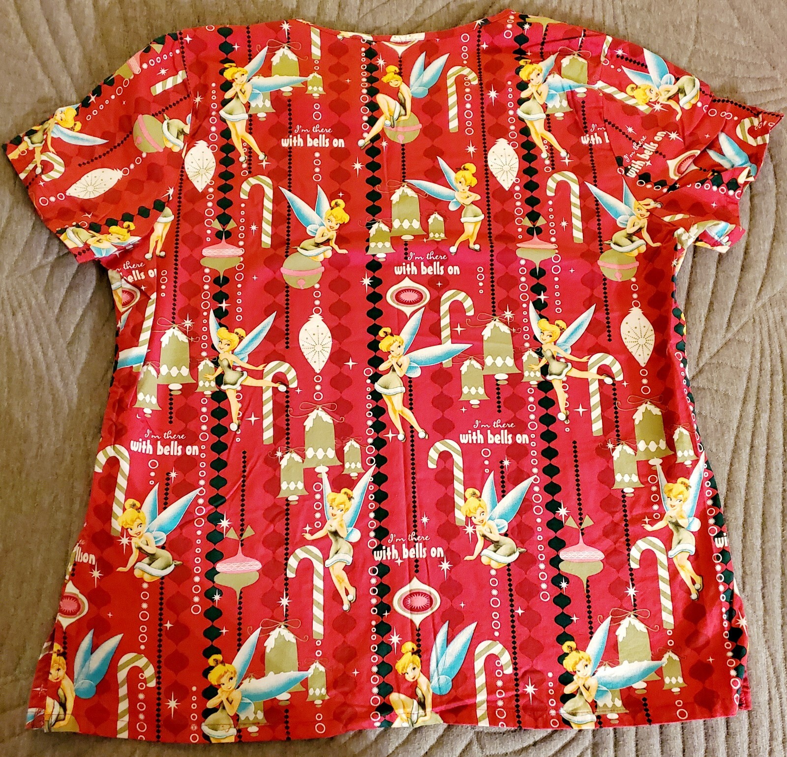 Disney Scrub Top Womens Large Tinker Bell Short Sleeve V Neck Christmas Winter