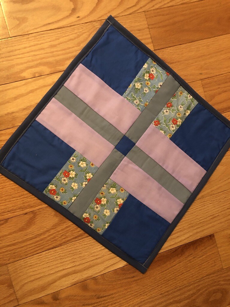 Quilted Table Topper/ Wall decoration blue, purple gray, 14.5 x 14.5 handmade