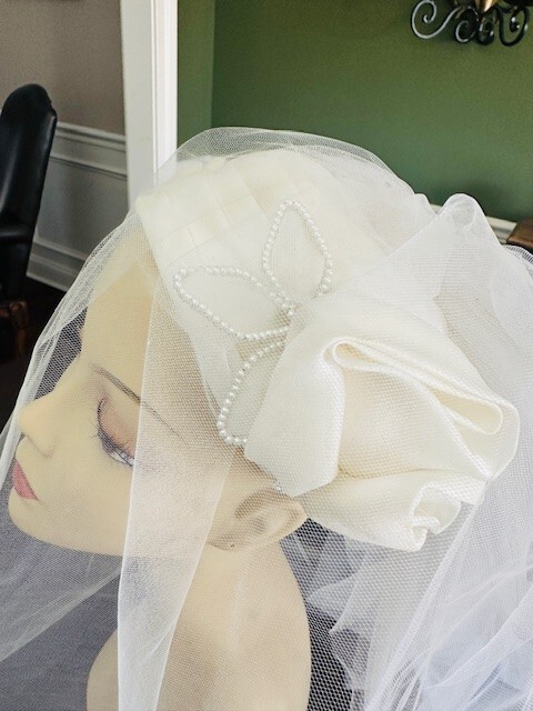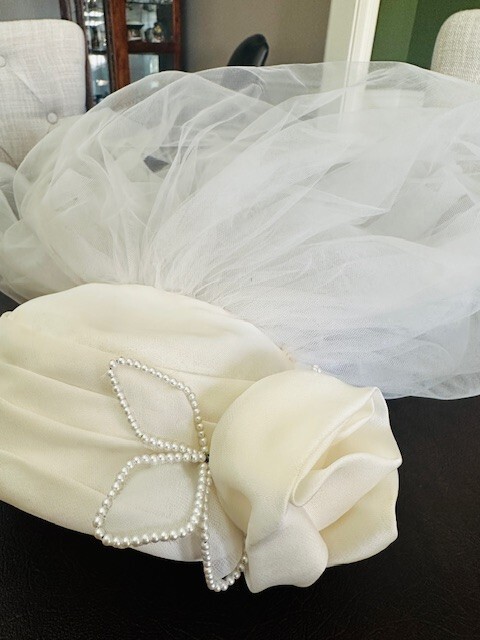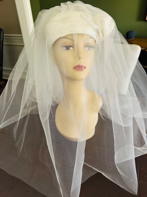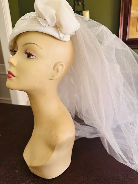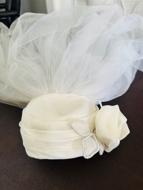 как выглядит Vintage Ivory Bridal Hat w/Attached Veil Floral Pearl Lace Tulle Vtg Wedding MCM фото