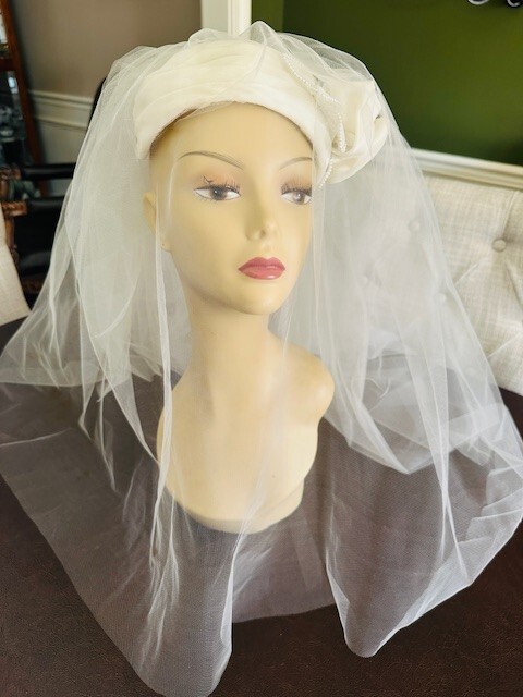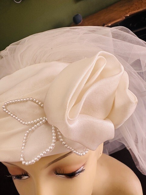 Vintage Ivory Bridal Hat w/Attached Veil Floral Pearl Lace Tulle Vtg Wedding MCM