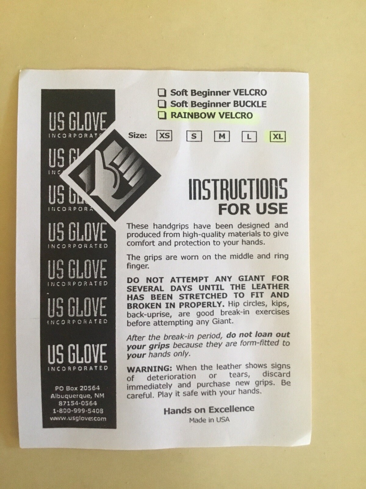 US GLOVE BEGINNER GYMNASTICS HOOK LOOP HAND GRIPS SZ X-LARGE RED WEIGHTLIFTING
