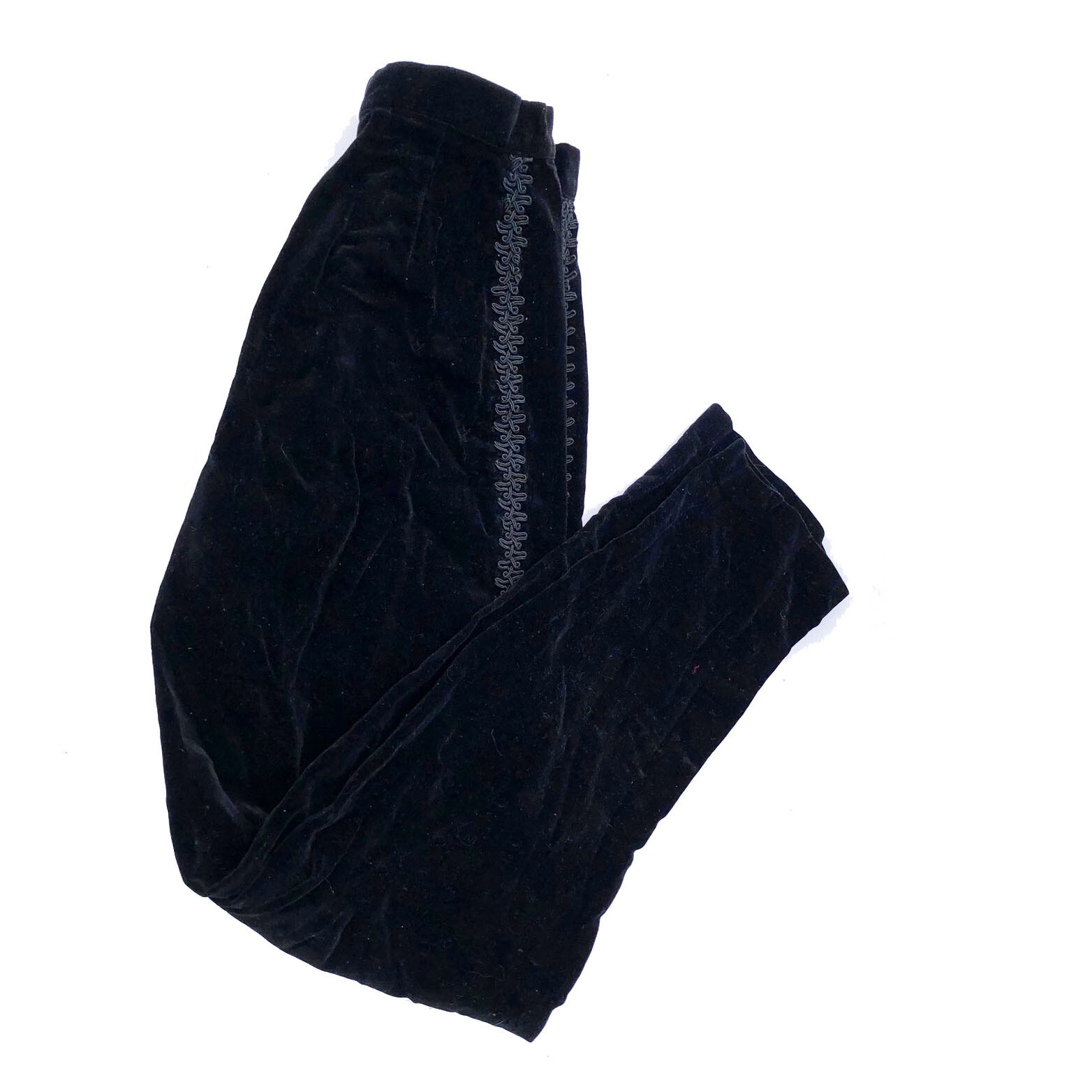 Vintage 70s Black Velvet Side trim Flat front Classic Skinny Evening Pants XS